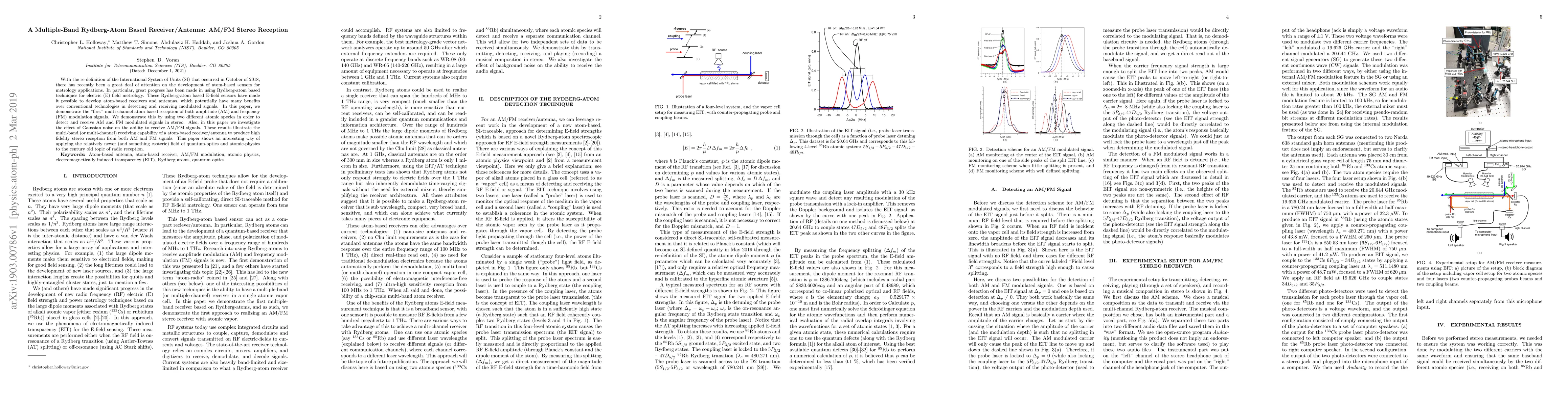 With the re-definition of the International System of Units (SI) that occurred in October of 2018, there has recently been a great deal of attention on the development of atom-based sensors for metrology applications. In particular, great progress has been made in using Rydberg-atom based techniques for electric (E) field metrology. These Rydberg-atom based E-field sensors have made it possible to develop atom-based receivers and antennas, which potentially have many benefits over conventional technologies in detecting and receiving modulated signals. In this paper, we demonstrate the ``first'' multi-channel atom-based reception of both amplitude (AM) and frequency (FM) modulation signals. We demonstrate this by using two different atomic species in order to detect and receive AM and FM modulated signals in stereo. Also, in this paper we investigate the effect of Gaussian noise on the ability to receive AM/FM signals. These results illustrate the multi-band (or multi-channel) receiving capability of a atom-based receiver/antenna to produce high fidelity stereo reception from both AM and FM signals. This paper shows an interesting way of applying the relatively newer (and something esoteric) field of quantum-optics and atomic-physics to the century old topic of radio reception.