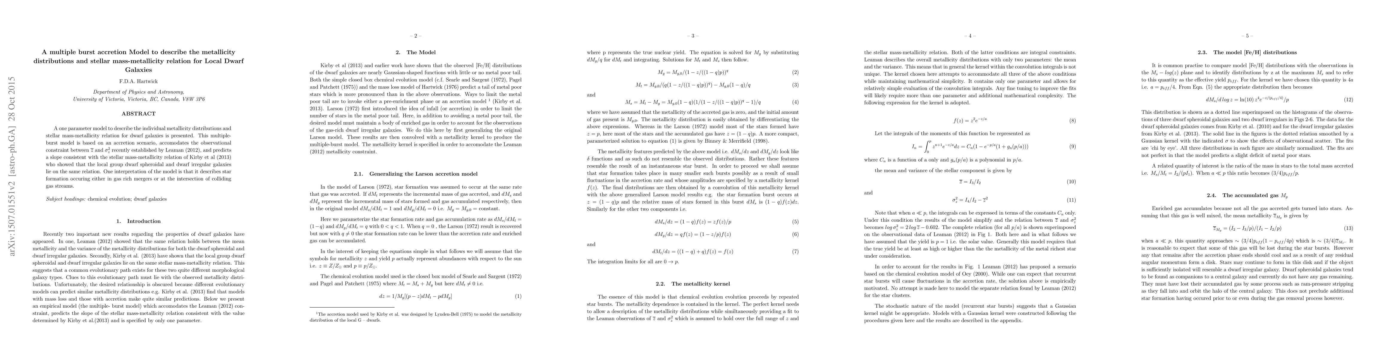 A one parameter model to describe the individual metallicity distributions and stellar mass-metallicity relation for dwarf galaxies is presented. This multiple-burst model is based on an accretion scenario, accomodates the observational constraint between $\overline{z}$ and $\sigma_{z}^{2}$ recently established by Leaman (2012), and predicts a slope consistent with the stellar mass-metallicity relation of Kirby et al (2013) who showed that the local group dwarf spheroidal and dwarf irregular galaxies lie on the same relation. One interpretation of the model is that it describes star formation occuring either in gas rich mergers or at the intersection of colliding gas streams.
