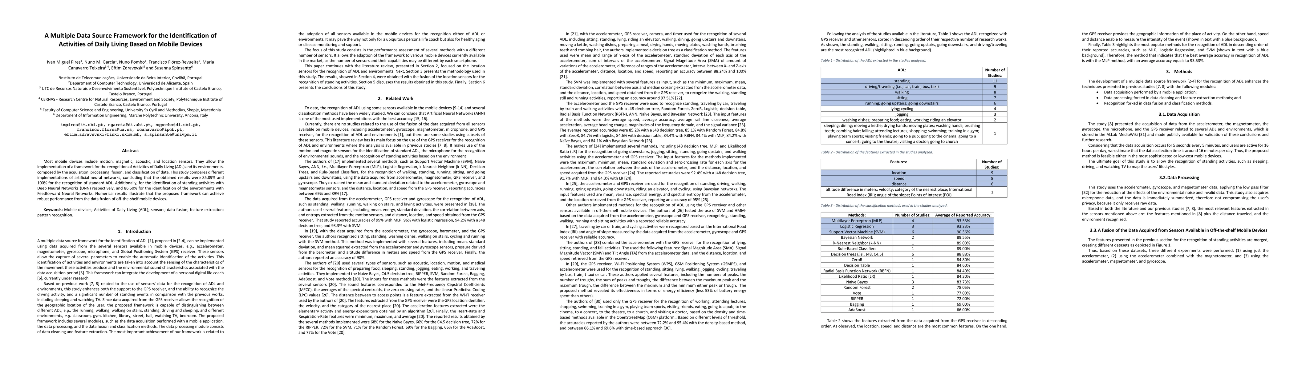 This paper proposes a framework for recognizing Activities of Daily Living (ADL) using data from mobile device sensors, achieving up to 100% accuracy in standard ADL recognition. The study demonstrates robust performance through the fusion of data from multiple sources, employing various neural network implementations.