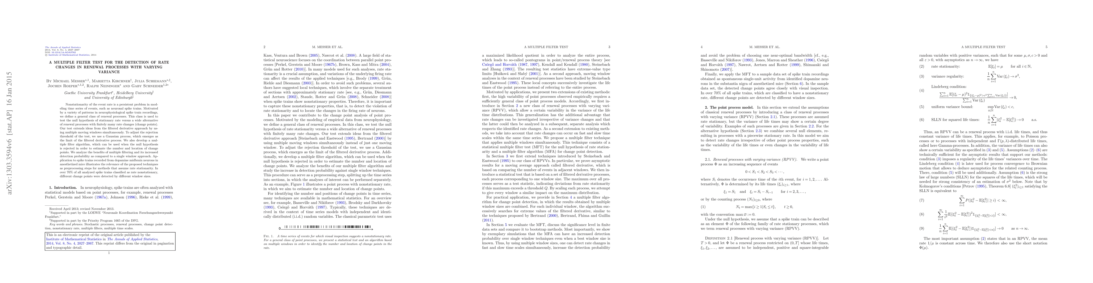 Nonstationarity of the event rate is a persistent problem in modeling time series of events, such as neuronal spike trains. Motivated by a variety of patterns in neurophysiological spike train recordings, we define a general class of renewal processes. This class is used to test the null hypothesis of stationary rate versus a wide alternative of renewal processes with finitely many rate changes (change points). Our test extends ideas from the filtered derivative approach by using multiple moving windows simultaneously. To adjust the rejection threshold of the test, we use a Gaussian process, which emerges as the limit of the filtered derivative process. We also develop a multiple filter algorithm, which can be used when the null hypothesis is rejected in order to estimate the number and location of change points. We analyze the benefits of multiple filtering and its increased detection probability as compared to a single window approach. Application to spike trains recorded from dopamine midbrain neurons in anesthetized mice illustrates the relevance of the proposed techniques as preprocessing steps for methods that assume rate stationarity. In over 70% of all analyzed spike trains classified as rate nonstationary, different change points were detected by different window sizes.