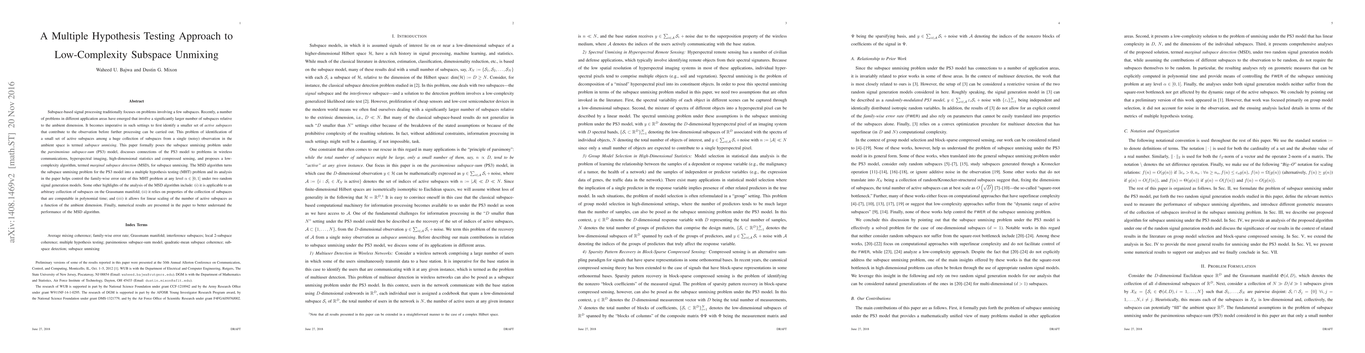 Subspace-based signal processing traditionally focuses on problems involving a few subspaces. Recently, a number of problems in different application areas have emerged that involve a significantly larger number of subspaces relative to the ambient dimension. It becomes imperative in such settings to first identify a smaller set of active subspaces that contribute to the observation before further processing can be carried out. This problem of identification of a small set of active subspaces among a huge collection of subspaces from a single (noisy) observation in the ambient space is termed subspace unmixing. This paper formally poses the subspace unmixing problem under the parsimonious subspace-sum (PS3) model, discusses connections of the PS3 model to problems in wireless communications, hyperspectral imaging, high-dimensional statistics and compressed sensing, and proposes a low-complexity algorithm, termed marginal subspace detection (MSD), for subspace unmixing. The MSD algorithm turns the subspace unmixing problem for the PS3 model into a multiple hypothesis testing (MHT) problem and its analysis in the paper helps control the family-wise error rate of this MHT problem at any level $\alpha \in [0,1]$ under two random signal generation models. Some other highlights of the analysis of the MSD algorithm include: (i) it is applicable to an arbitrary collection of subspaces on the Grassmann manifold; (ii) it relies on properties of the collection of subspaces that are computable in polynomial time; and ($iii$) it allows for linear scaling of the number of active subspaces as a function of the ambient dimension. Finally, numerical results are presented in the paper to better understand the performance of the MSD algorithm.