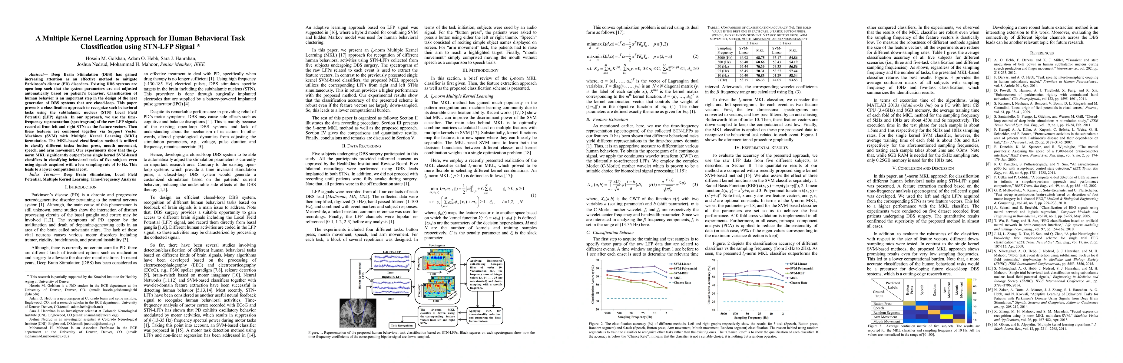 This research introduces a Multiple Kernel Learning (MKL) approach using subthalamic nucleus (STN) Local Field Potential (LFP) signals for classifying human behavioral tasks like button press, mouth movement, speech, and arm movement. The method, which outperforms single kernel SVM, shows promise for closed-loop Deep Brain Stimulation (DBS) systems in managing Parkinson's disease, even with low sampling rate signals, leading to lower computational costs.