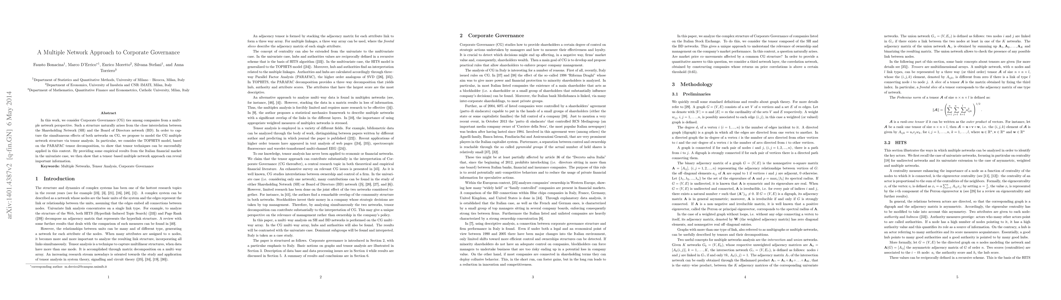 In this work, we consider Corporate Governance (CG) ties among companies from a multiple network perspective. Such a structure naturally arises from the close interrelation between the Shareholding Network (SH) and the Board of Directors network (BD). In order to capture the simultaneous effects of both networks on CG, we propose to model the CG multiple network structure via tensor analysis. In particular, we consider the TOPHITS model, based on the PARAFAC tensor decomposition, to show that tensor techniques can be successfully applied in this context. By providing some empirical results from the Italian financial market in the univariate case, we then show that a tensor--based multiple network approach can reveal important information.