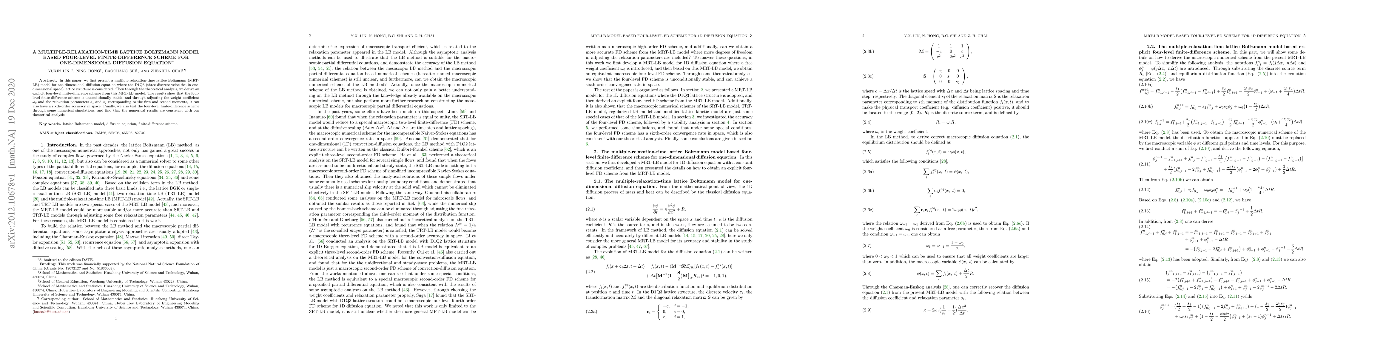 This paper presents a multiple-relaxation-time lattice Boltzmann model for solving the one-dimensional diffusion equation using a D1Q3 lattice structure. It derives an explicit four-level finite-difference scheme from this model, demonstrating its unconditional stability and sixth-order accuracy in space, validated by numerical simulations.