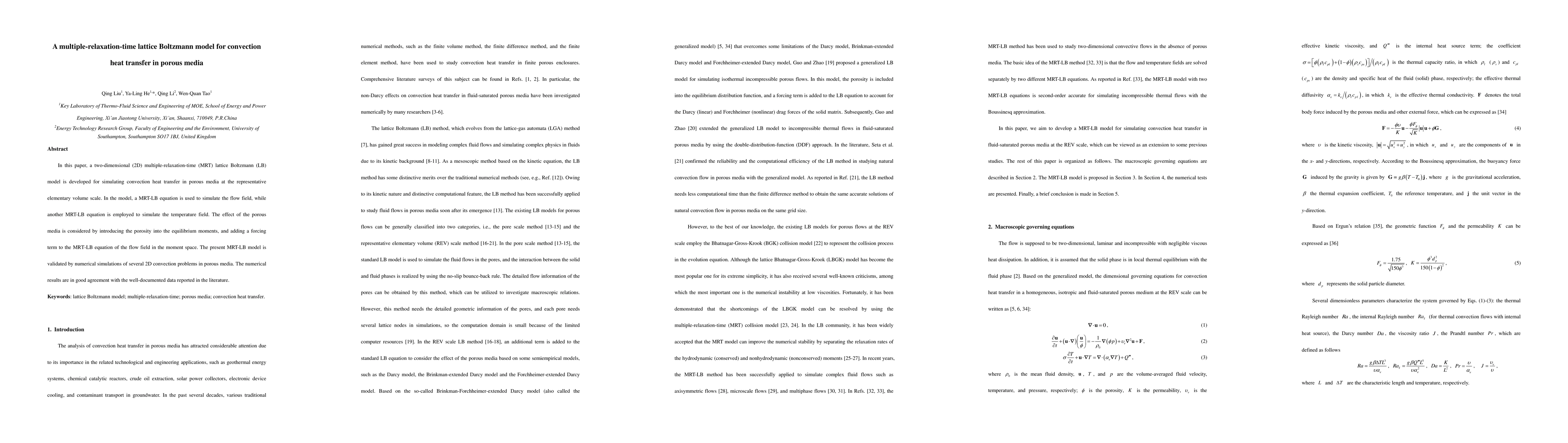 This paper presents a two-dimensional MRT lattice Boltzmann model for simulating convection heat transfer in porous media, using separate MRT-LB equations for flow and temperature fields. The model incorporates porosity effects and is validated against documented literature data, showing good agreement.
