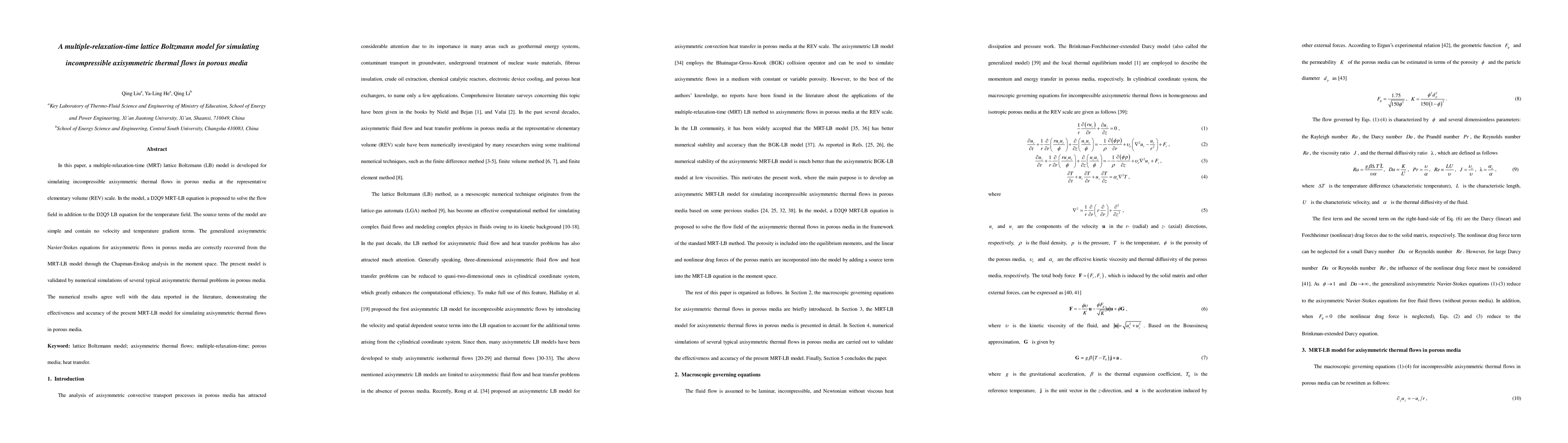 This paper presents a multiple-relaxation-time (MRT) lattice Boltzmann (LB) model for simulating incompressible axisymmetric thermal flows in porous media. The model uses a D2Q9 MRT-LB equation for the flow field and a D2Q5 LB equation for the temperature field, validated through numerical simulations that match existing literature data.