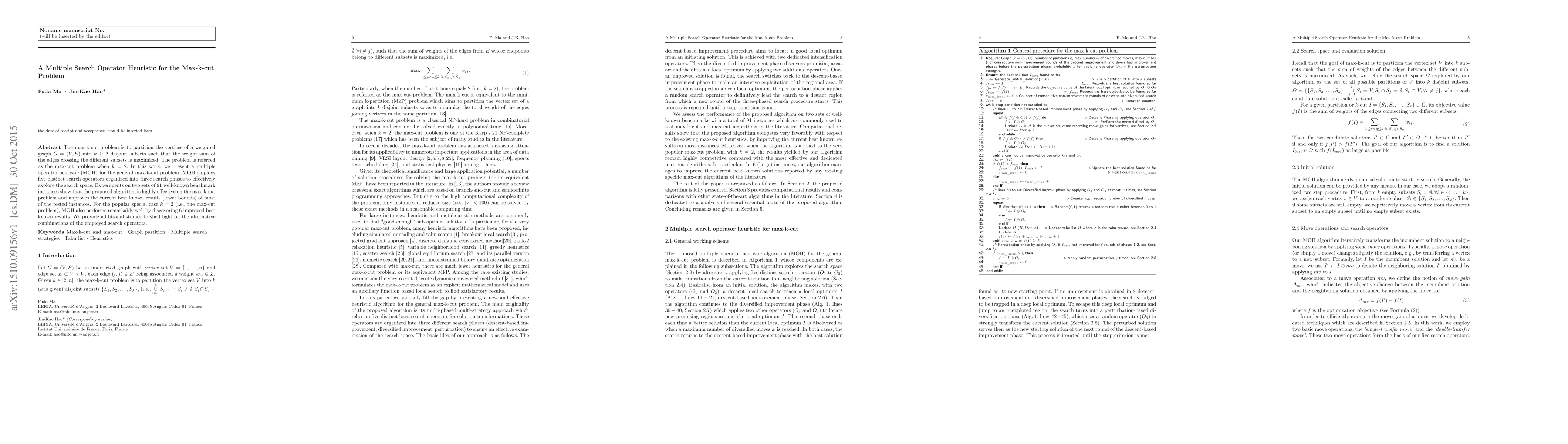 This paper introduces a multiple operator heuristic (MOH) for the max-k-cut problem, employing five distinct search operators to partition graph vertices into $k$ subsets to maximize edge weight sum across partitions. Experiments demonstrate MOH's effectiveness, improving current best known results on benchmark instances and achieving notable improvements for the max-cut problem.