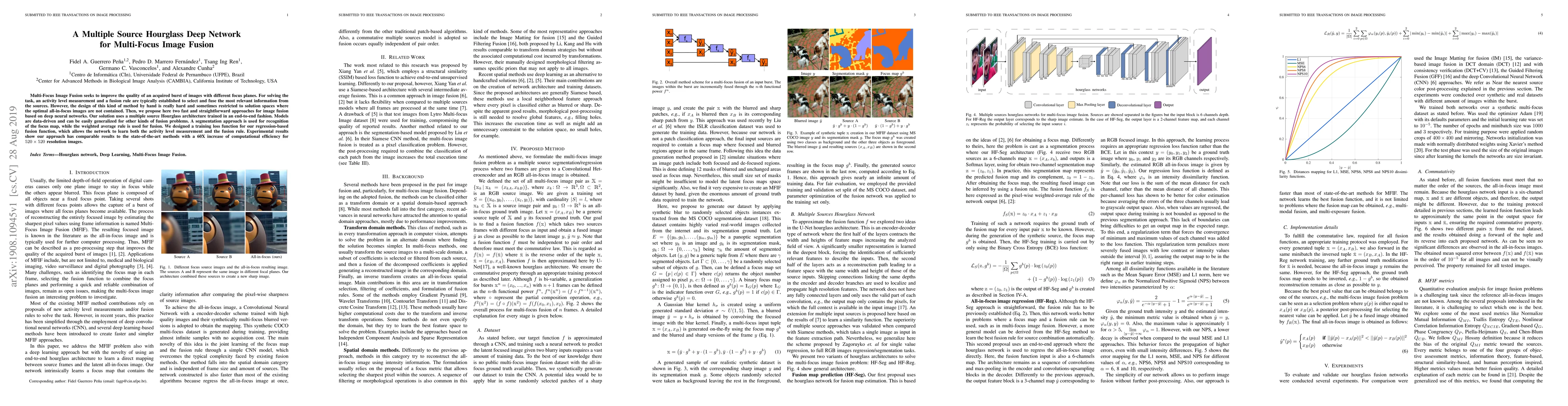 This paper proposes a deep neural network using a multiple source Hourglass architecture for multi-focus image fusion, achieving high computational efficiency and comparable results to state-of-the-art methods through end-to-end training and a data-driven fusion approach. The network learns both activity level measurement and fusion rules, demonstrating significant efficiency gains.