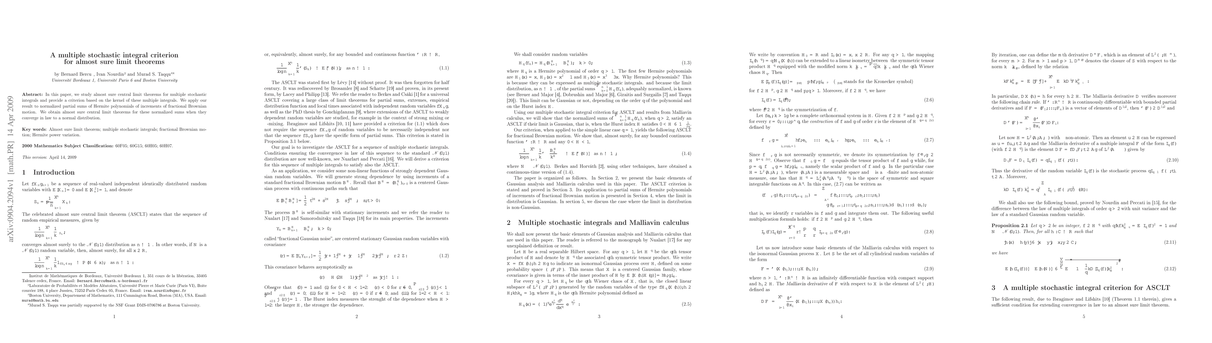 This paper presents a criterion for almost sure central limit theorems for multiple stochastic integrals, particularly for normalized partial sums of Hermite polynomials derived from fractional Brownian motion, showing convergence to a normal distribution. The result hinges on the properties of the integral kernel.