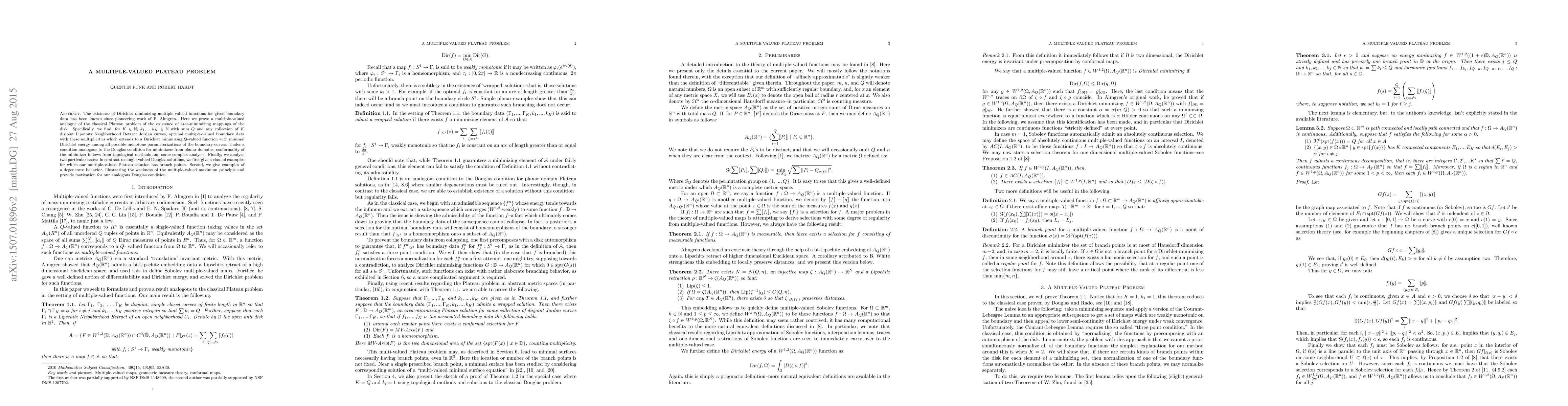 The paper proves the existence of area-minimizing multiple-valued functions for given boundary data, with implications for conformality and branch points in certain cases.