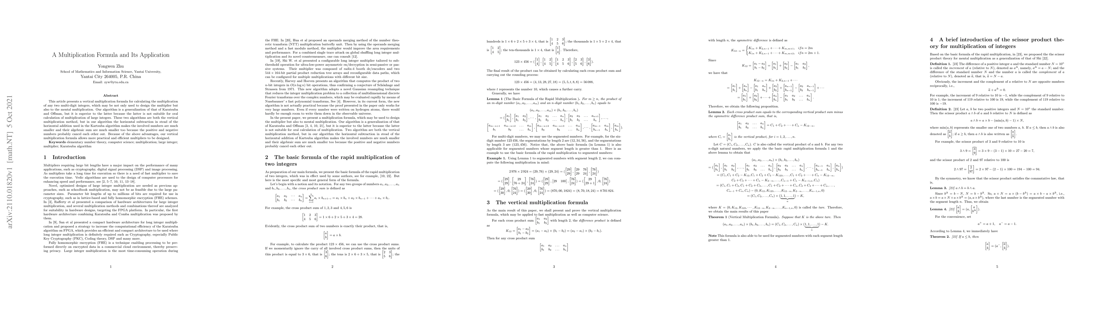 This article presents a vertical multiplication formula for calculating the multiplication of any two multi-digit integers, which may be not only used to design the multiplier but also to the mental multiplication. Our algorithm is a generalization of that of Karatsuba and Offman, but it is superior to the latter because the latter is not suitable for oral calculation of multiplication of large integers. These two algorithms are both the vertical multiplication method, but in our algorithm the horizontal subtraction in stead of the horizontal addition used in the Kartsuba algorithm makes the involved numbers are much smaller and their algebraic sum are much smaller too because the positive and negative numbers probably cancel each other out. Because of the above advantages, our vertical multiplication formula allows more practical and efficient multipliers to be designed.