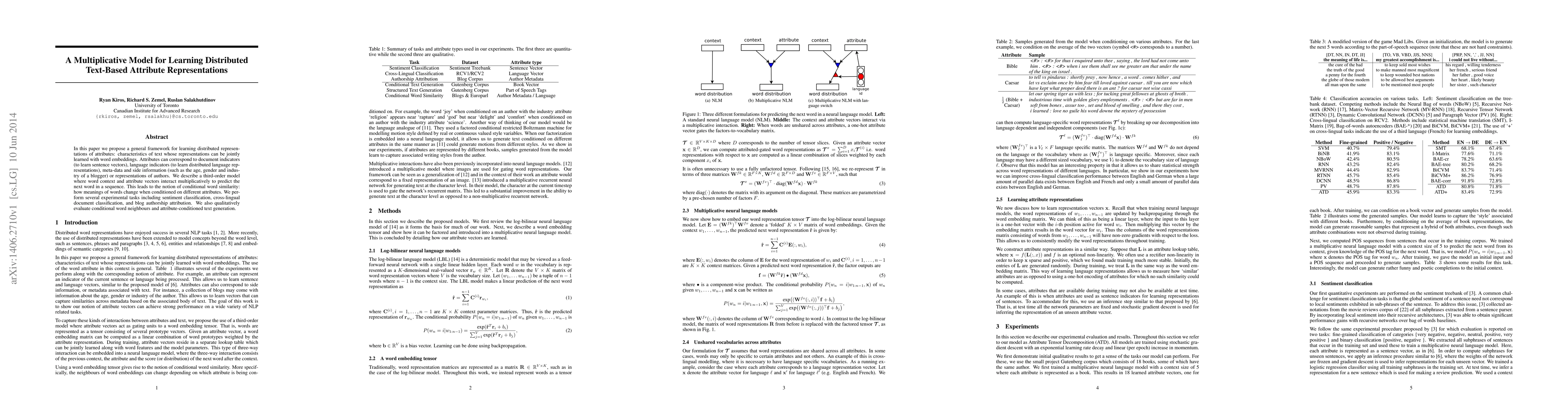 In this paper we propose a general framework for learning distributed representations of attributes: characteristics of text whose representations can be jointly learned with word embeddings. Attributes can correspond to document indicators (to learn sentence vectors), language indicators (to learn distributed language representations), meta-data and side information (such as the age, gender and industry of a blogger) or representations of authors. We describe a third-order model where word context and attribute vectors interact multiplicatively to predict the next word in a sequence. This leads to the notion of conditional word similarity: how meanings of words change when conditioned on different attributes. We perform several experimental tasks including sentiment classification, cross-lingual document classification, and blog authorship attribution. We also qualitatively evaluate conditional word neighbours and attribute-conditioned text generation.