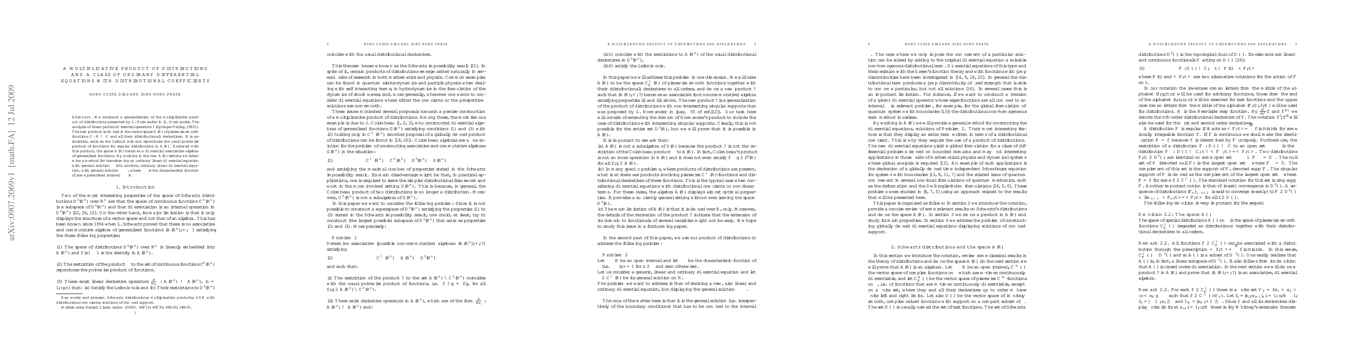 This paper generalizes L. Hörmander's multiplicative product of distributions and defines a new associative product in the space of piecewise smooth functions and their derivatives. It introduces a method to transform ordinary differential equations using this product, resulting in equations with solutions modified by characteristic functions of specified intervals.