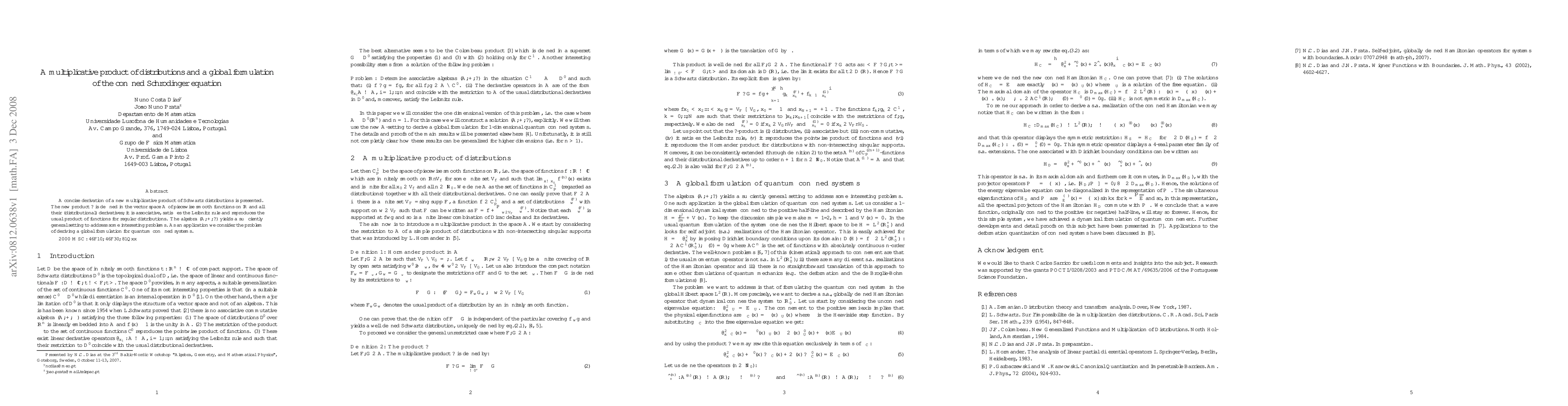 A concise derivation of a new multiplicative product of Schwartz distributions is presented. The new product $\star$ is defined in the vector space ${\cal A}$ of piecewise smooth functions on $\bkR$ and all their (distributional) derivatives; it is associative, satisfies the Leibnitz rule and reproduces the usual product of functions for regular distributions. The algebra $({\cal A},+,\star)$ yields a sufficiently general setting to address some interesting problems. As an application we consider the problem of deriving a global formulation for quantum confined systems.