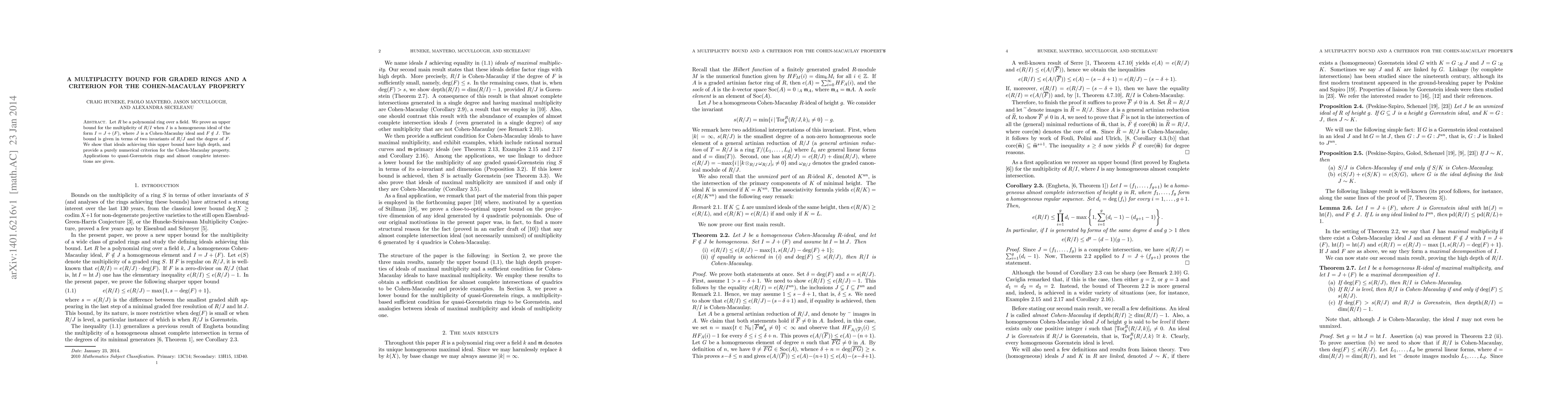 This research establishes an upper bound for the multiplicity of a quotient ring $R/I$, where $I$ is a specific homogeneous ideal. The bound is expressed using invariants of $R/J$ and the degree of $F$, with $I = J + (F)$ and $F otin J$. The study also reveals that ideals reaching this bound exhibit high depth and provides a numerical criterion for the Cohen-Macaulay property. Applications to quasi-Gorenstein rings and almost complete intersections are demonstrated.