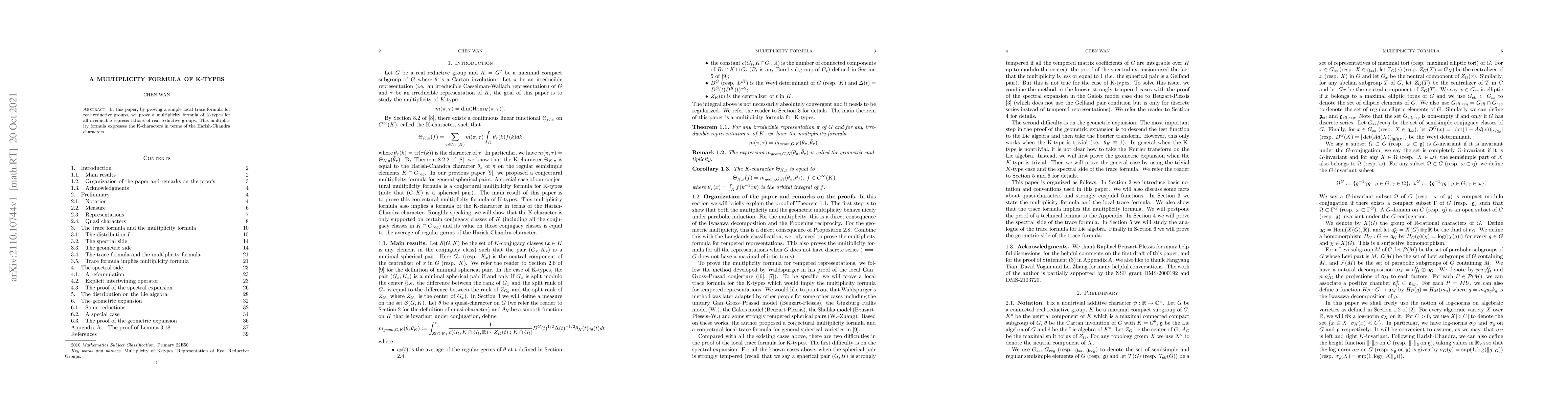 This paper establishes a multiplicity formula for K-types in irreducible representations of real reductive groups, leveraging a local trace formula to express K-characters in terms of Harish-Chandra characters.