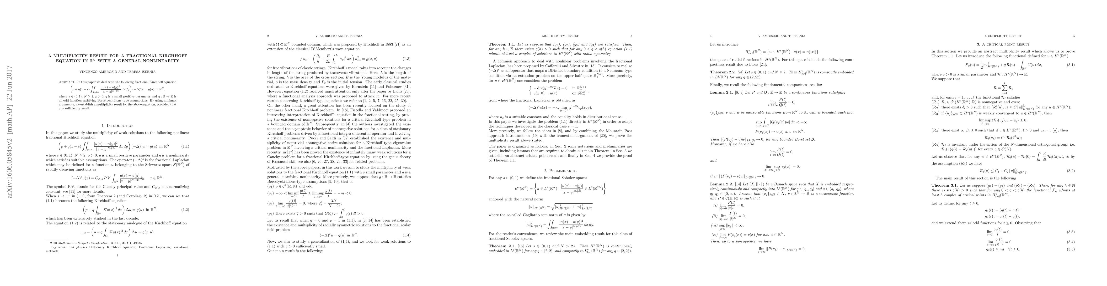 Researchers prove a multiplicity result for a fractional Kirchhoff equation with a general nonlinearity, showing multiple solutions exist under certain conditions, using minimax arguments.