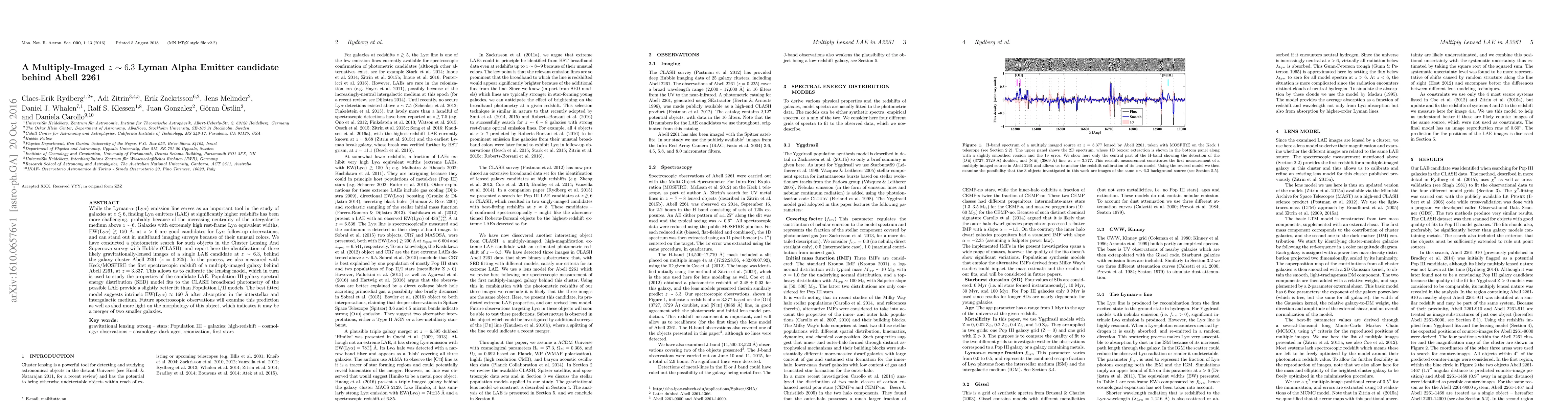 This paper identifies three likely gravitationally-lensed images of a high-redshift ($z\sim6.3$) Lyman Alpha Emitter (LAE) candidate behind the Abell 2261 galaxy cluster, using CLASH survey data. The study also calibrates the lensing model using a spectroscopic redshift of another galaxy at $z=3.337$, and suggests the LAE may be a merger based on its morphology.