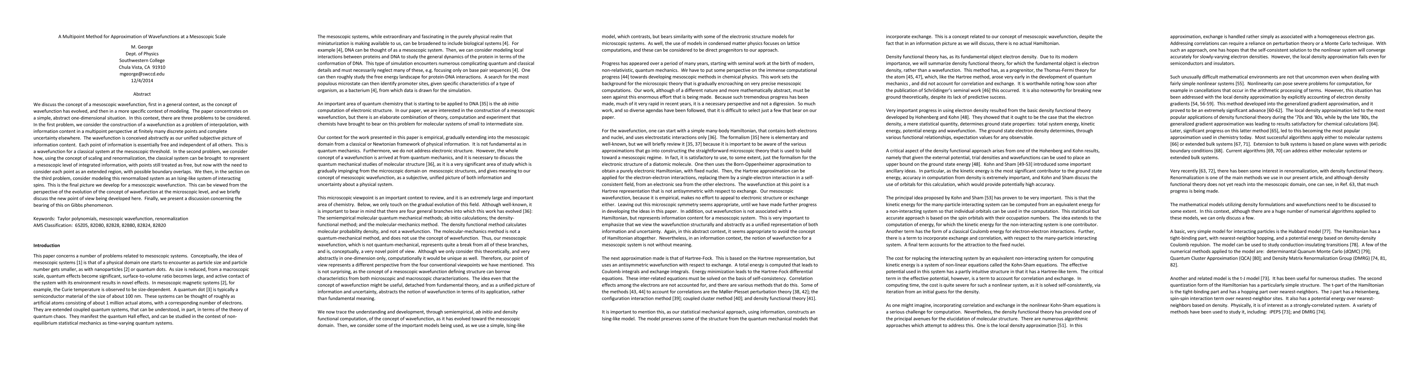 This paper explores the concept of mesoscopic wavefunctions, focusing on a one-dimensional model. It introduces a multipoint method for constructing wavefunctions through interpolation and renormalization, ultimately modeling the system as an Ising-like system of interacting spins, and discusses its implications for the Gibbs phenomenon.