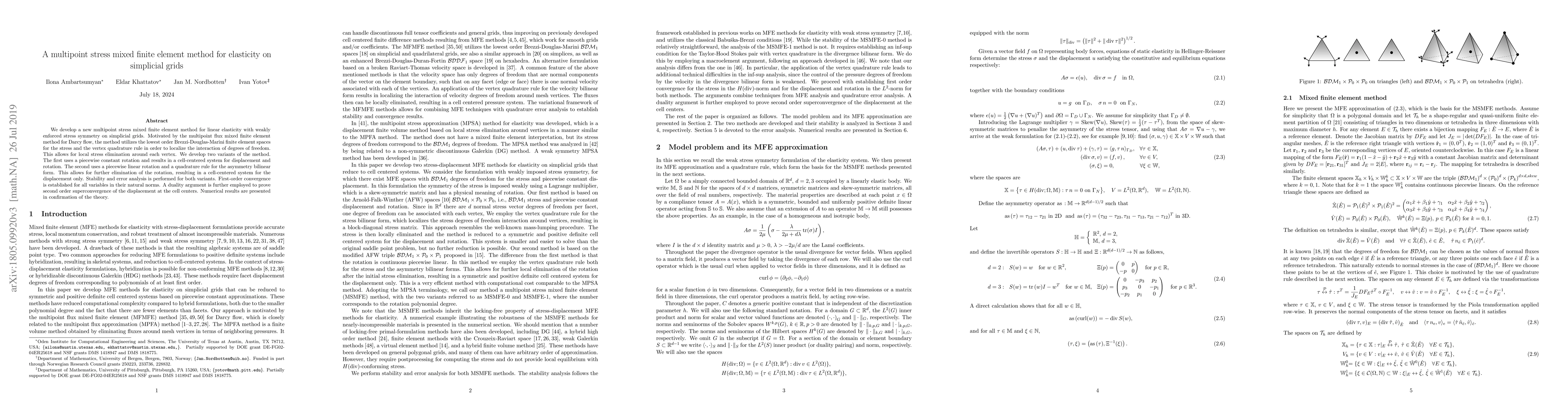 This paper introduces a new multipoint stress mixed finite element method for linear elasticity on simplicial grids, utilizing Brezzi-Douglas-Marini spaces and vertex quadrature rules. Two variants are developed, with the second variant achieving a cell-centered system for displacement only, and both variants showing first-order convergence and second-order superconvergence of displacement.