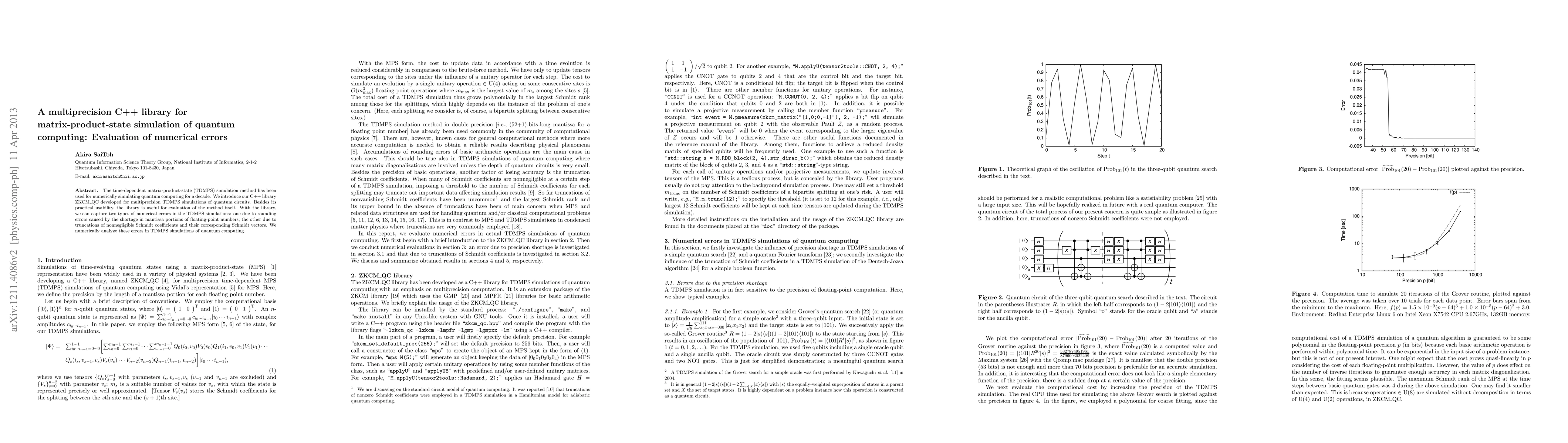 The paper presents a C++ library, ZKCM_QC, for multiprecision simulations of quantum computing using the time-dependent matrix-product-state method. It evaluates two types of numerical errors: rounding errors from floating-point precision and truncation errors from Schmidt coefficient reductions.