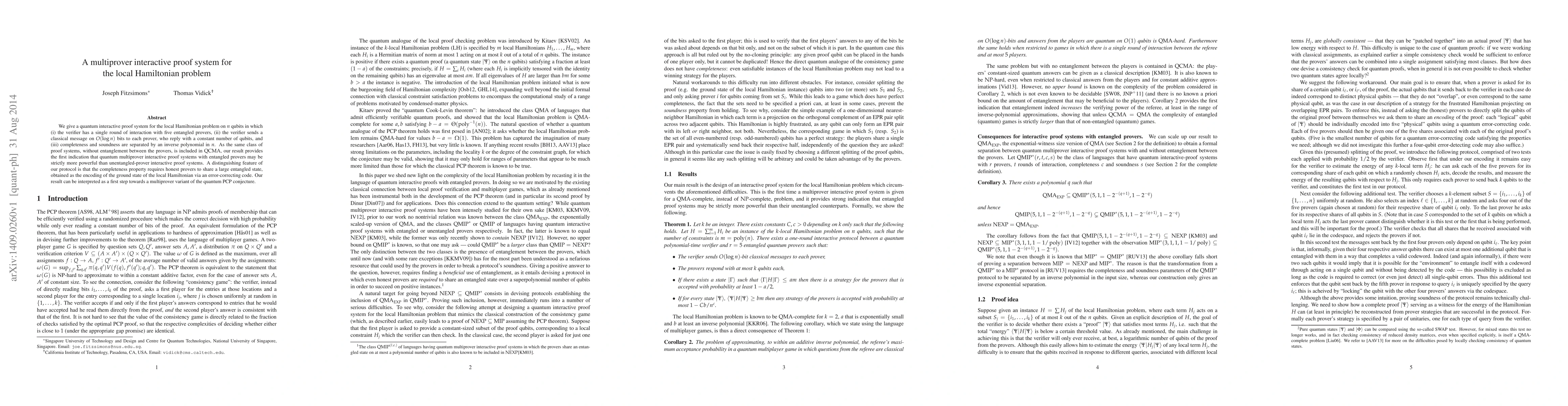 This paper proposes a quantum interactive proof system for the local Hamiltonian problem, showing that systems with entangled provers can be more powerful than unentangled-prover systems, while also highlighting the importance of shared entanglement in achieving completeness.