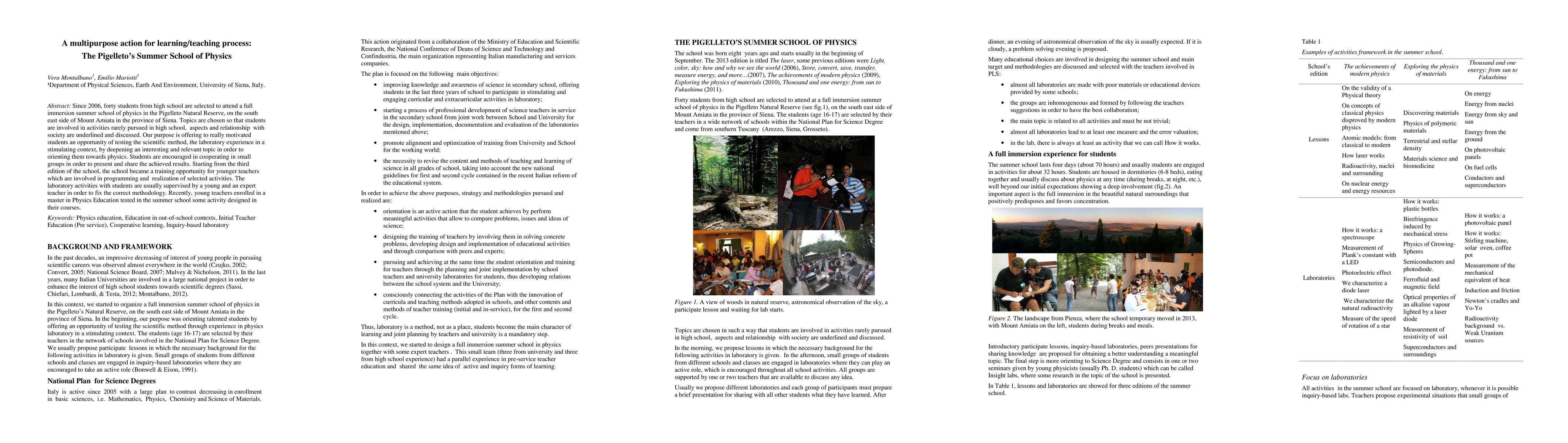Since 2006, forty students from high school are selected to attend a full immersion summer school of physics in the Pigelleto Natural Reserve, on the south east side of Mount Amiata in the province of Siena. Topics are chosen so that students are involved in activities rarely pursued in high school, aspects and relationship with society are underlined and discussed. Our purpose is offering to really motivated students an opportunity of testing the scientific method, the laboratory experience in a stimulating context, by deepening an interesting and relevant topic in order to orienting them towards physics. Students are encouraged in cooperating in small groups in order to present and share the achieved results. Starting from the third edition of the school, the school became a training opportunity for younger teachers which are involved in programming and realization of selected activities. The laboratory activities with students are usually supervised by a young and an expert teacher in order to fix the correct methodology. Recently, young teachers enrolled in a master in Physics Education tested in the summer school some activity designed in their courses.