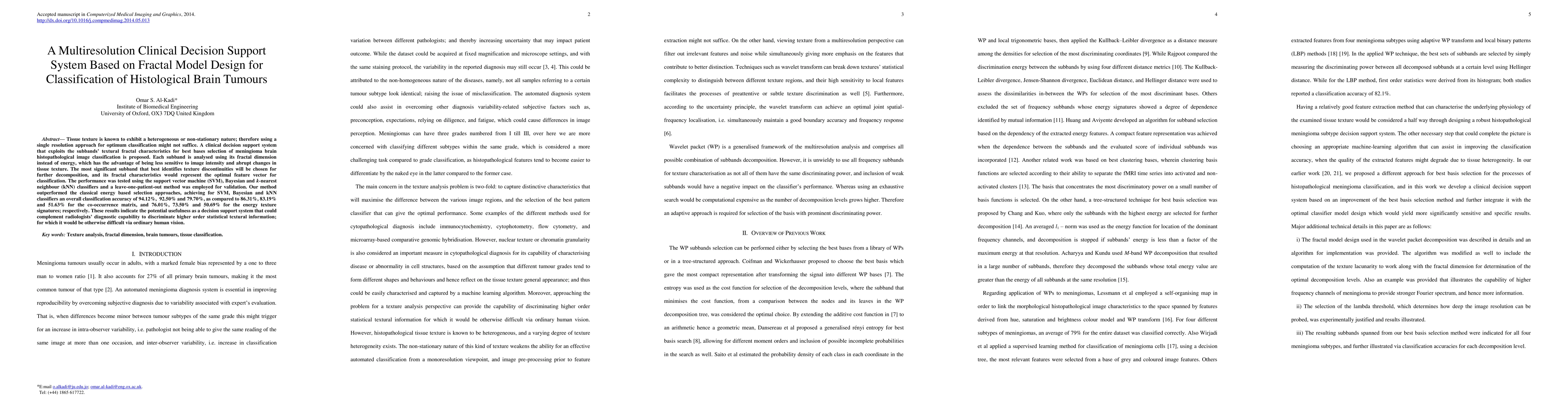 This paper proposes a multiresolution clinical decision support system using fractal model design to classify histological brain tumours based on tissue texture analysis. The system selects the most significant subband for optimal feature vector representation, outperforming classical energy-based approaches with classification accuracies of 94.12%, 92.50%, and 79.70% for SVM, Bayesian, and kNN classifiers, respectively.