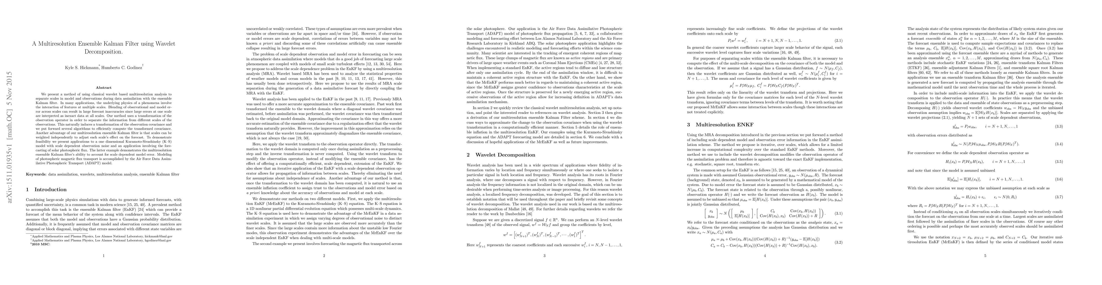 This paper introduces a multiresolution ensemble Kalman filter that leverages wavelet decomposition to separate scales in model and observations, addressing inaccuracies from blending errors across scales. The method allows independent weighting of scales and demonstrates applications in a Kuramoto-Sivashinsky model and solar photospheric flux forecasting using the ADAPT model.