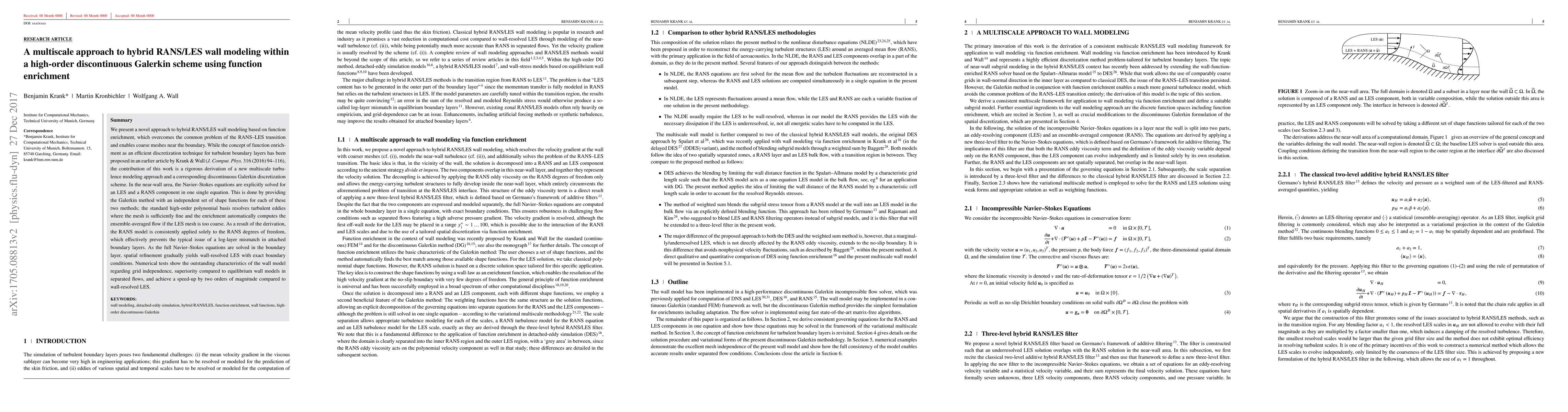 We present a novel approach to hybrid RANS/LES wall modeling based on function enrichment, which overcomes the common problem of the RANS-LES transition and enables coarse meshes near the boundary. While the concept of function enrichment as an efficient discretization technique for turbulent boundary layers has been proposed in an earlier article by Krank & Wall (J. Comput. Phys. 316 (2016) 94-116), the contribution of this work is a rigorous derivation of a new multiscale turbulence modeling approach and a corresponding discontinuous Galerkin discretization scheme. In the near-wall area, the Navier-Stokes equations are explicitly solved for an LES and a RANS component in one single equation. This is done by providing the Galerkin method with an independent set of shape functions for each of these two methods; the standard high-order polynomial basis resolves turbulent eddies where the mesh is sufficiently fine and the enrichment automatically computes the ensemble-averaged flow if the LES mesh is too coarse. As a result of the derivation, the RANS model is consistently applied solely to the RANS degrees of freedom, which effectively prevents the typical issue of a log-layer mismatch in attached boundary layers. As the full Navier-Stokes equations are solved in the boundary layer, spatial refinement gradually yields wall-resolved LES with exact boundary conditions. Numerical tests show the outstanding characteristics of the wall model regarding grid independence, superiority compared to equilibrium wall models in separated flows, and achieve a speed-up by two orders of magnitude compared to wall-resolved LES.