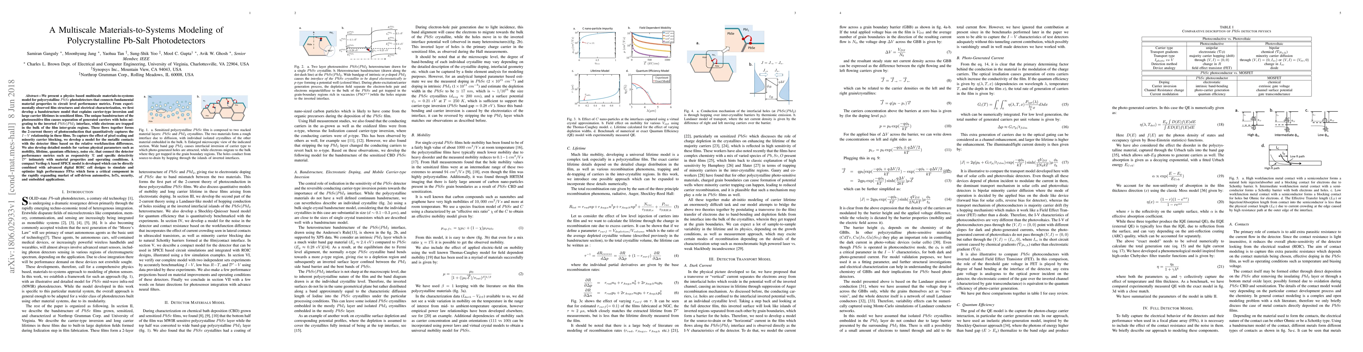 We present a physics based multiscale materials-to-systems model for polycrystalline $PbSe$ photodetectors that connects fundamental material properties to circuit level performance metrics. From experimentally observed film structures and electrical characterization, we first develop a bandstructure model that explains carrier-type inversion and large carrier lifetimes in sensitized films. The unique bandstructure of the photosensitive film causes separation of generated carriers with holes migrating to the inverted $PbSe|PbI_2$ interface, while electrons are trapped in the bulk of the film inter-grain regions. These flows together forms the 2-current theory of photoconduction that quantitatively captures the $I-V$ relationship in these films. To capture the effect of pixel scaling and minority carrier blocking, we develop a model for the metallic contacts with the detector films based on the relative workfunction differences. We also develop detailed models for various physical parameters such as mobility, lifetime, quantum efficiency, noise etc. that connect the detector performance metrics such as responsivity $\mathcal{R}$ and specific detectivity $\mathcal{D^*}$ intimately with material properties and operating conditions. A compact Verilog-A based SPICE model is developed which can be directly combined with advanced digital ROIC cell designs to simulate and optimize high performance FPAs which form a critical component in the rapidly expanding market of self-driven automotive, IoTs, security, and embedded applications.