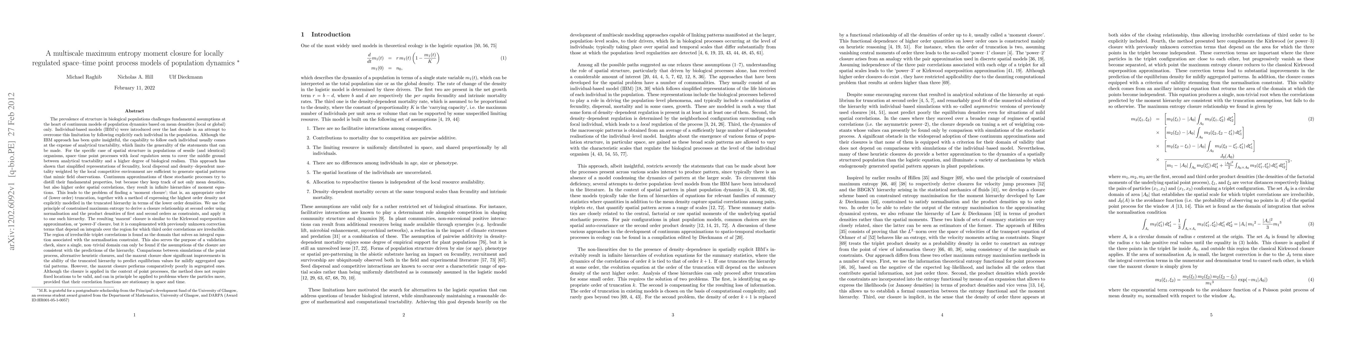 The pervasive presence spatial and size structure in biological populations challenges fundamental assumptions at the heart of continuum models of population dynamics based on mean densities (local or global) only. Individual-based models (IBM's) were introduced over the last decade in an attempt to overcome this limitation by following explicitly each individual in the population. Although the IBM approach has been quite insightful, the capability to follow each individual usually comes at the expense of analytical tractability, which limits the generality of the statements that can be made. For the specific case of spatial structure in populations of sessile (and identical) organisms, space-time point processes with local regulation seem to cover the middle ground between analytical tractability and a higher degree of biological realism. Continuum approximations of these stochastic processes distill their fundamental properties, but they often result in infinite hierarchies of moment equations. We use the principle of constrained maximum entropy to derive a closure relationship for one such hierarchy truncated at second order using normalization and the product densities of first and second orders as constraints. The resulting `maxent' closure is similar to the Kirkwood superposition approximation, but it is complemented with previously unknown correction terms that depend on on the area for which third order correlations are irreducible. This region also serves as a validation check, since it can only be found if the assumptions of the closure are met. Comparisons between simulations of the point process, alternative heuristic closures, and the maxent closure show significant improvements in the ability of the maxent closure to predict equilibrium values for mildly aggregated spatial patterns.