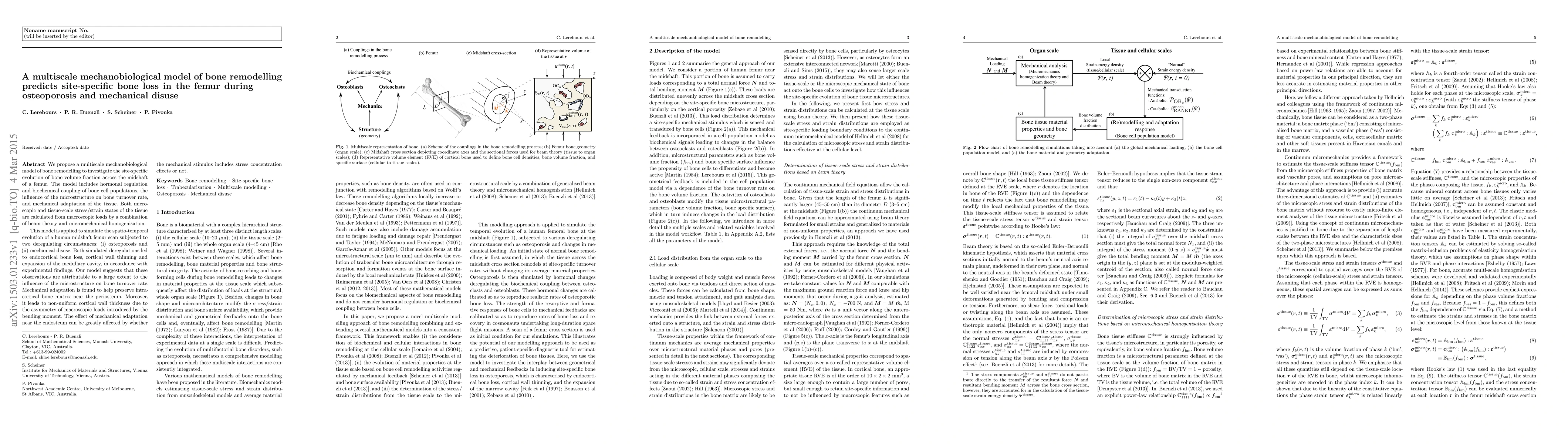 This research proposes a multiscale mechanobiological model to simulate bone remodelling, predicting site-specific bone loss in the femur during osteoporosis and mechanical disuse. The model integrates hormonal regulation, biochemical coupling, and mechanical adaptation, showing endocortical bone loss and cortical thinning consistent with experimental data.