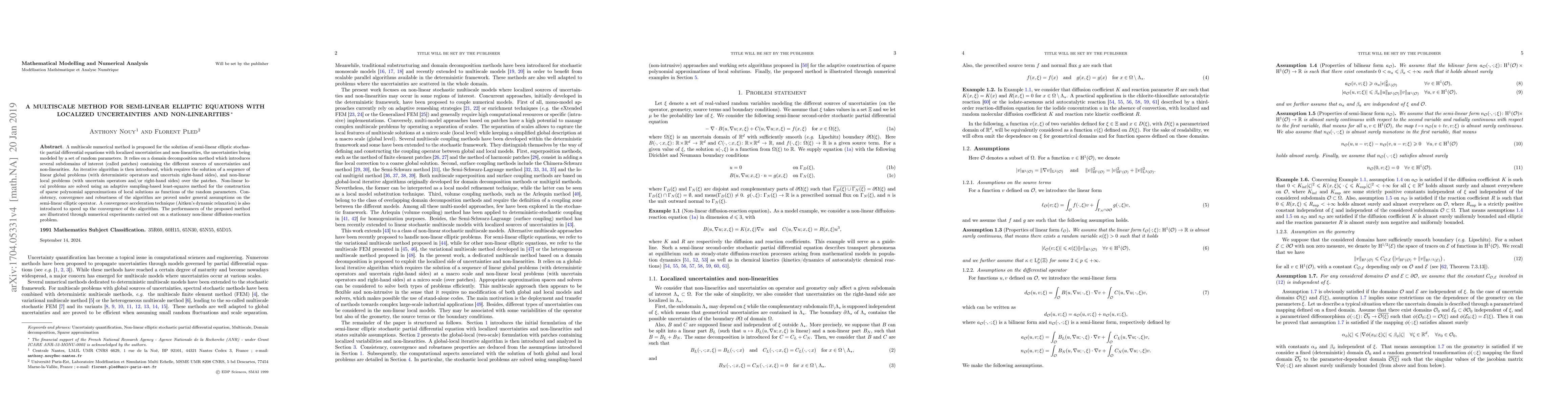 A multiscale numerical method is proposed for the solution of semi-linear elliptic stochastic partial differential equations with localized uncertainties and non-linearities, the uncertainties being modeled by a set of random parameters. It relies on a domain decomposition method which introduces several subdomains of interest (called patches) containing the different sources of uncertainties and non-linearities. An iterative algorithm is then introduced, which requires the solution of a sequence of linear global problems (with deterministic operators and uncertain right-hand sides), and non-linear local problems (with uncertain operators and/or right-hand sides) over the patches. Non-linear local problems are solved using an adaptive sampling-based least-squares method for the construction of sparse polynomial approximations of local solutions as functions of the random parameters. Consistency, convergence and robustness of the algorithm are proved under general assumptions on the semi-linear elliptic operator. A convergence acceleration technique (Aitken's dynamic relaxation) is also introduced to speed up the convergence of the algorithm. The performances of the proposed method are illustrated through numerical experiments carried out on a stationary non-linear diffusion-reaction problem.