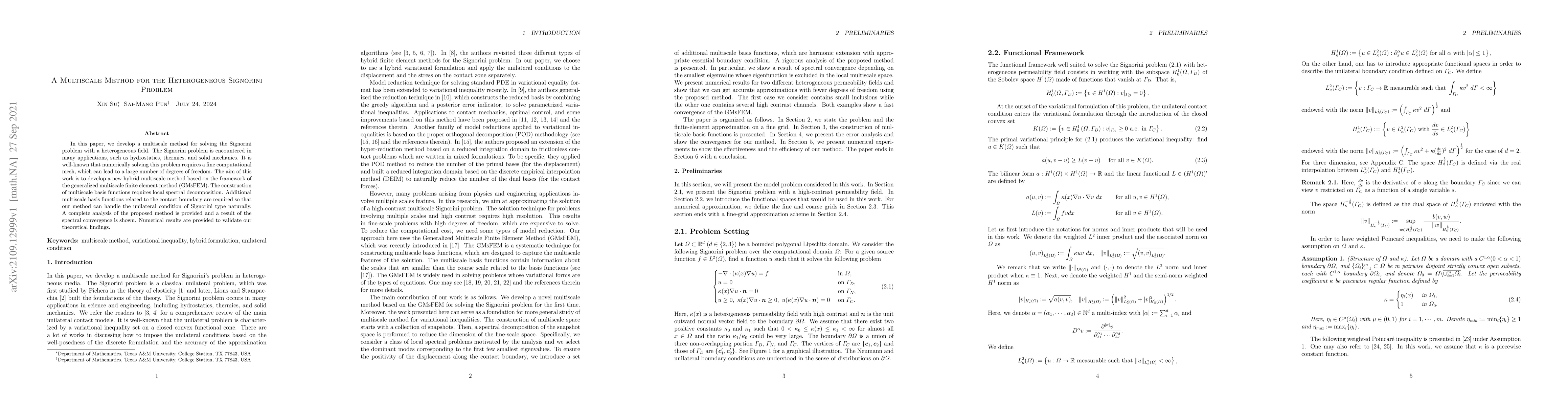 Researchers developed a multiscale method to solve the Signorini problem with heterogeneous fields, improving computational efficiency by reducing degrees of freedom. The new hybrid approach uses generalized multiscale finite element methods and local spectral decomposition for accurate results.