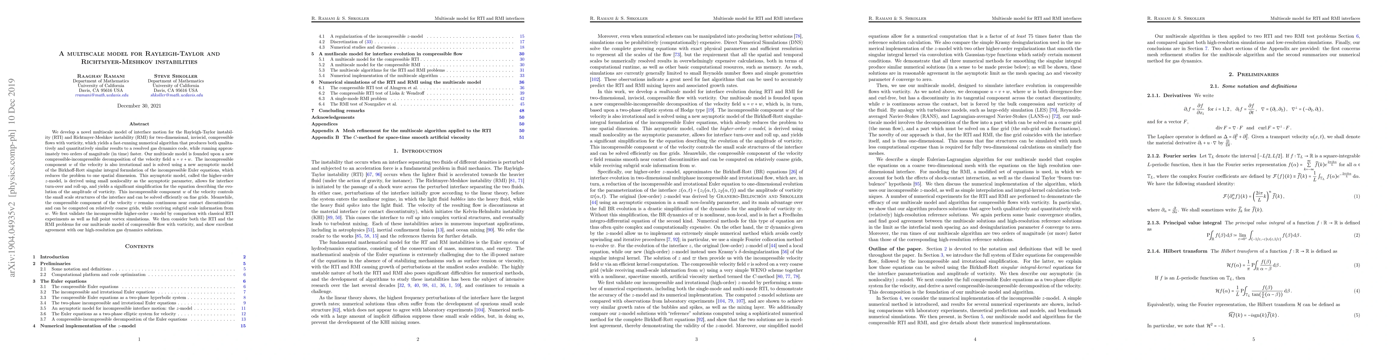 This paper presents a multiscale model for simulating Rayleigh-Taylor and Richtmyer-Meshkov instabilities, achieving significant computational speedups. The model decomposes the velocity field into compressible and incompressible components, with the latter solved using an efficient asymptotic model, allowing for accurate interface dynamics and fast computation.