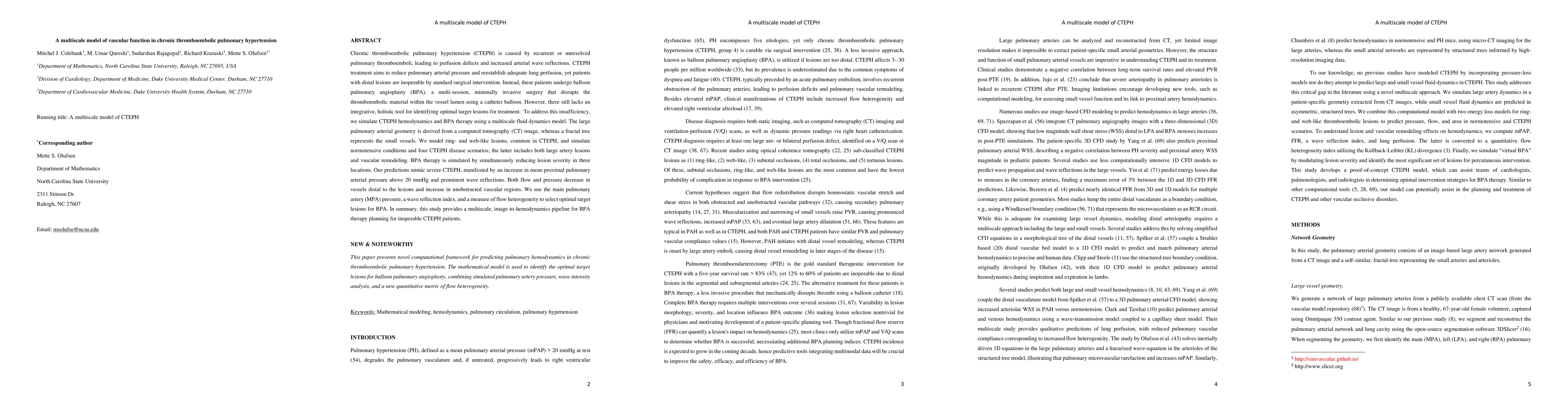 This paper develops a multiscale fluid dynamics model to simulate chronic thromboembolic pulmonary hypertension (CTEPH) and balloon pulmonary angioplasty (BPA) therapy, aiming to identify optimal target lesions for treatment in inoperable patients. The model integrates large artery geometry from CT images and small vessel fractal trees, simulating various CTEPH scenarios and BPA interventions to predict hemodynamic changes and select optimal BPA targets.