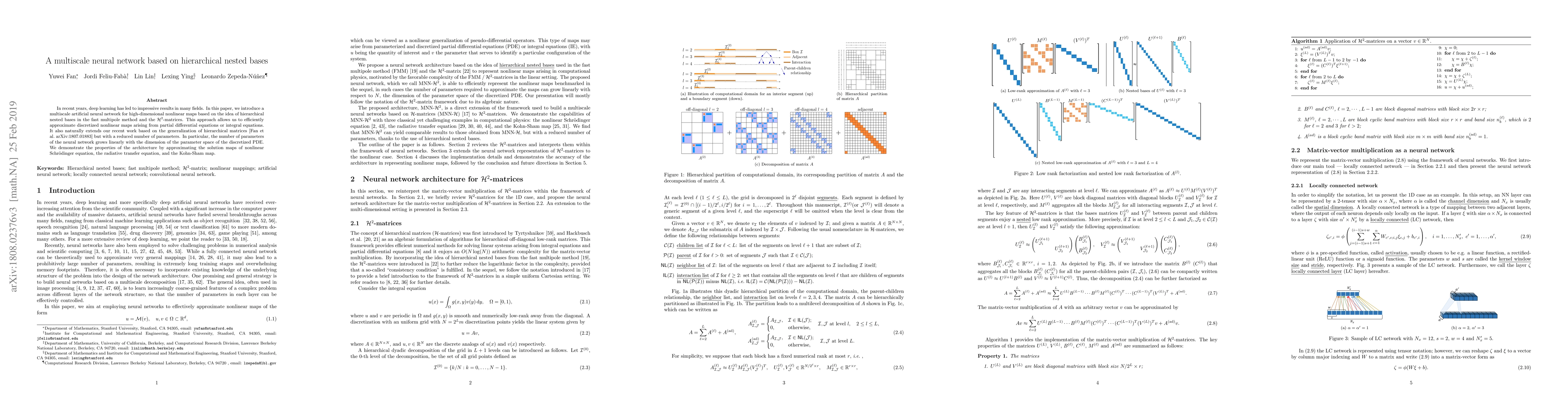 In recent years, deep learning has led to impressive results in many fields. In this paper, we introduce a multi-scale artificial neural network for high-dimensional non-linear maps based on the idea of hierarchical nested bases in the fast multipole method and the $\mathcal{H}^2$-matrices. This approach allows us to efficiently approximate discretized nonlinear maps arising from partial differential equations or integral equations. It also naturally extends our recent work based on the generalization of hierarchical matrices [Fan et al. arXiv:1807.01883] but with a reduced number of parameters. In particular, the number of parameters of the neural network grows linearly with the dimension of the parameter space of the discretized PDE. We demonstrate the properties of the architecture by approximating the solution maps of non-linear Schr{\"o}dinger equation, the radiative transfer equation, and the Kohn-Sham map.