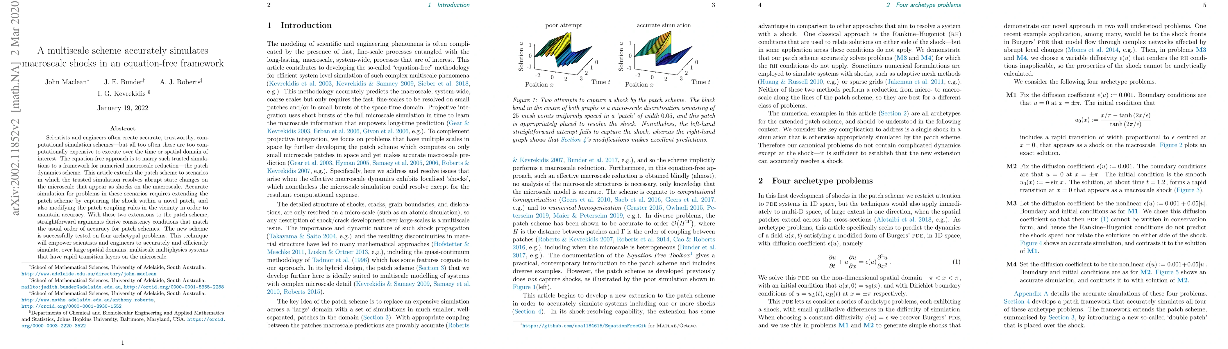 This paper proposes an equation-free multiscale scheme that accurately simulates macroscale shocks using the patch dynamics framework. The scheme extends the patch method to capture microscale shocks and modifies coupling rules to maintain accuracy, enabling efficient simulation of large-scale multiphysics systems.