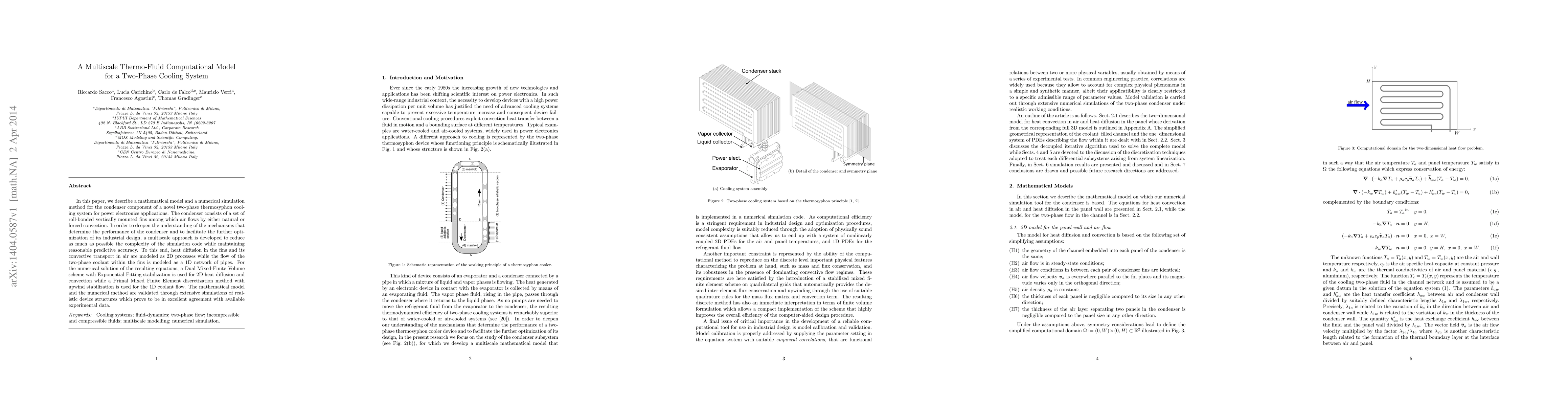 In this paper, we describe a mathematical model and a numerical simulation method for the condenser component of a novel two-phase thermosyphon cooling system for power electronics applications. The condenser consists of a set of roll-bonded vertically mounted fins among which air flows by either natural or forced convection. In order to deepen the understanding of the mechanisms that determine the performance of the condenser and to facilitate the further optimization of its industrial design, a multiscale approach is developed to reduce as much as possible the complexity of the simulation code while maintaining reasonable predictive accuracy. To this end, heat diffusion in the fins and its convective transport in air are modeled as 2D processes while the flow of the two-phase coolant within the fins is modeled as a 1D network of pipes. For the numerical solution of the resulting equations, a Dual Mixed-Finite Volume scheme with Exponential Fitting stabilization is used for 2D heat diffusion and convection while a Primal Mixed Finite Element discretization method with upwind stabilization is used for the 1D coolant flow. The mathematical model and the numerical method are validated through extensive simulations of realistic device structures which prove to be in excellent agreement with available experimental data.