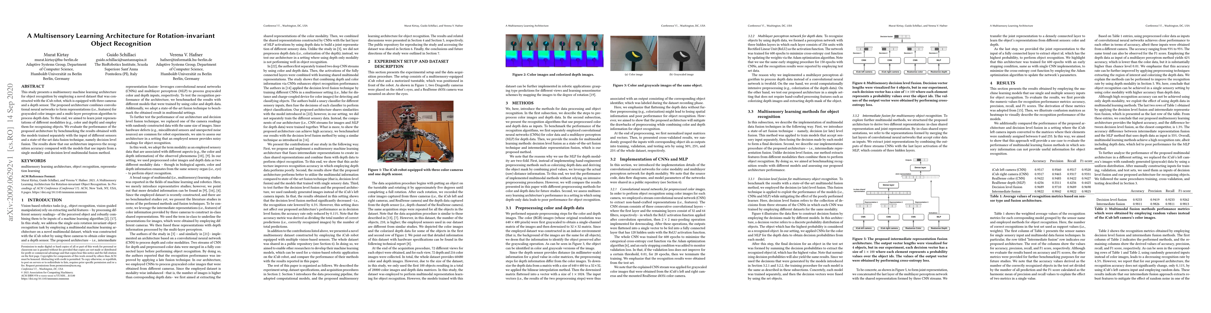 This study presents a multisensory machine learning architecture for object recognition by employing a novel dataset that was constructed with the iCub robot, which is equipped with three cameras and a depth sensor. The proposed architecture combines convolutional neural networks to form representations (i.e., features) for grayscaled color images and a multi-layer perceptron algorithm to process depth data. To this end, we aimed to learn joint representations of different modalities (e.g., color and depth) and employ them for recognizing objects. We evaluate the performance of the proposed architecture by benchmarking the results obtained with the models trained separately with the input of different sensors and a state-of-the-art data fusion technique, namely decision level fusion. The results show that our architecture improves the recognition accuracy compared with the models that use inputs from a single modality and decision level multimodal fusion method.