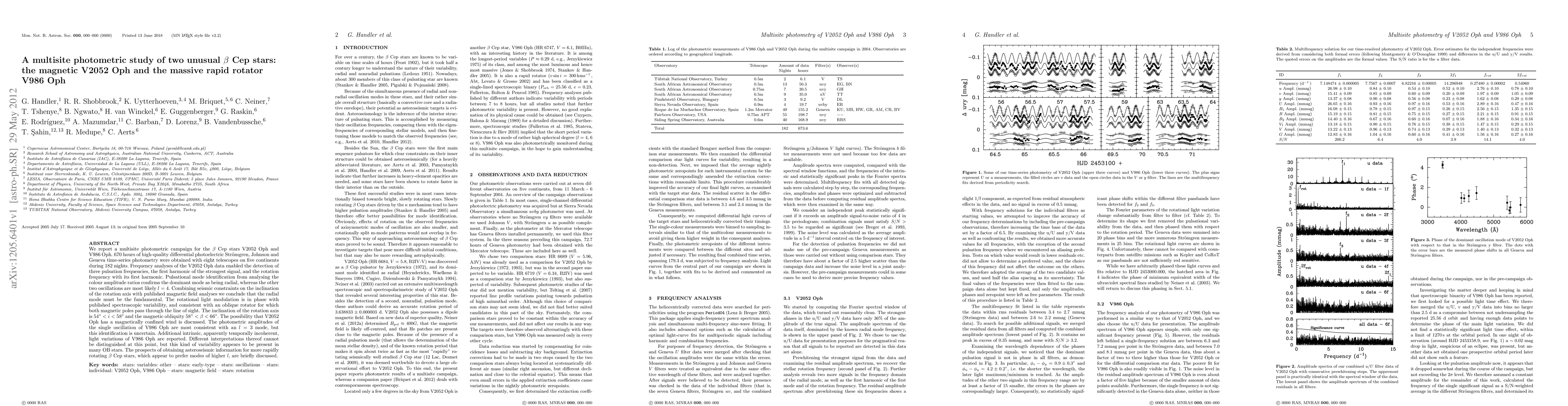 We report a multisite photometric campaign for the Beta Cep stars V2052 Oph and V986 Oph. 670 hours of high-quality differential photoelectric Stromgren, Johnson and Geneva time-series photometry were obtained with eight telescopes on five continents during 182 nights. Frequency analyses of the V2052 Oph data enabled the detection of three pulsation frequencies, the first harmonic of the strongest signal, and the rotation frequency with its first harmonic. Pulsational mode identification from analysing the colour amplitude ratios confirms the dominant mode as being radial, whereas the other two oscillations are most likely l=4. Combining seismic constraints on the inclination of the rotation axis with published magnetic field analyses we conclude that the radial mode must be the fundamental. The rotational light modulation is in phase with published spectroscopic variability, and consistent with an oblique rotator for which both magnetic poles pass through the line of sight. The inclination of the rotation axis is 54o