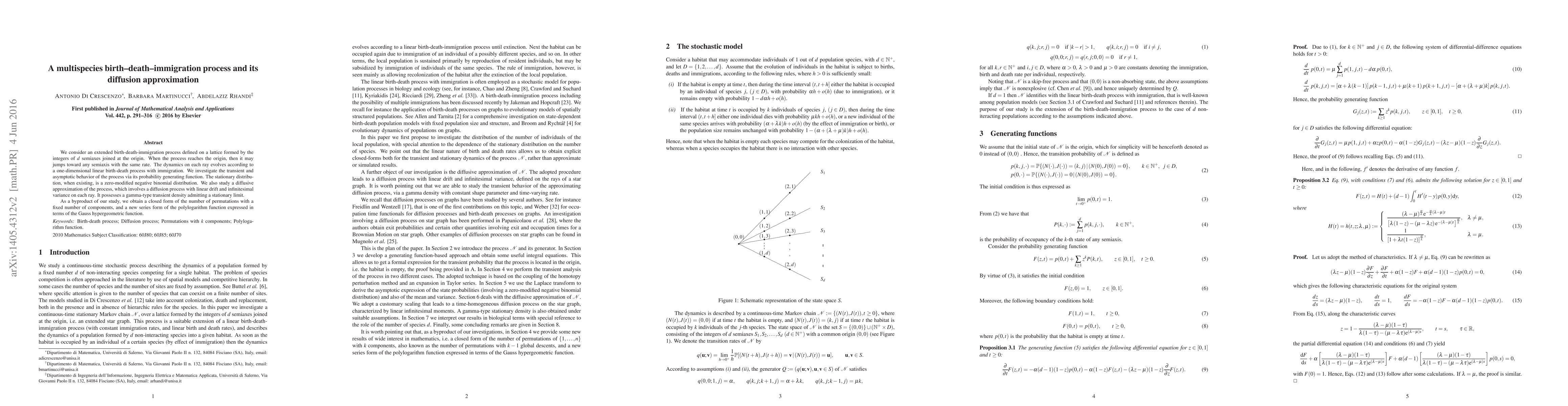 We consider an extended birth-death-immigration process defined on a lattice formed by the integers of $d$ semiaxes joined at the origin. When the process reaches the origin, then it may jumps toward any semiaxis with the same rate. The dynamics on each ray evolves according to a one-dimensional linear birth-death process with immigration. We investigate the transient and asymptotic behavior of the process via its probability generating function. The stationary distribution, when existing, is a zero-modified negative binomial distribution. We also study a diffusive approximation of the process, which involves a diffusion process with linear drift and infinitesimal variance on each ray. It possesses a gamma-type transient density admitting a stationary limit. As a byproduct of our study, we obtain a closed form of the number of permutations with a fixed number of components, and a new series form of the polylogarithm function expressed in terms of the Gauss hypergeometric function.