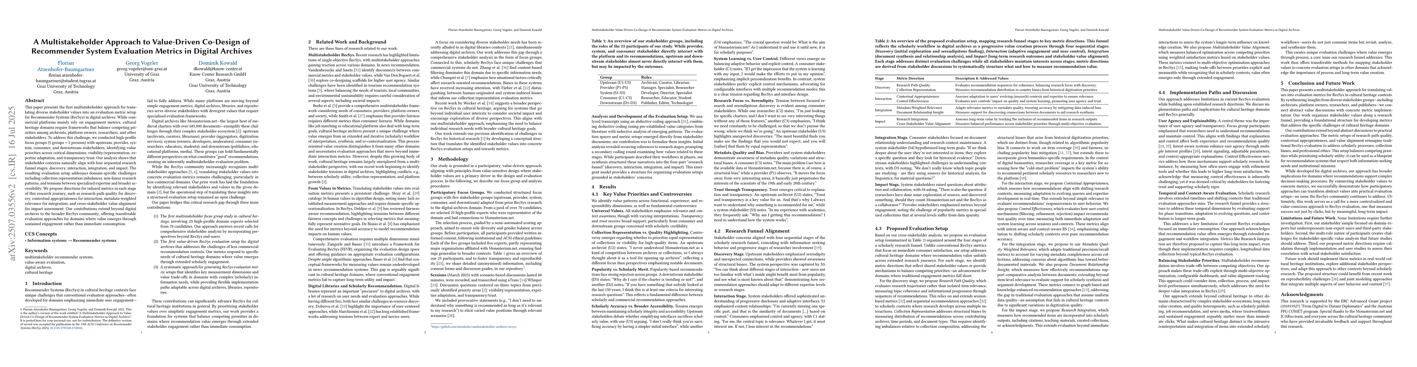 This paper presents the first multistakeholder approach for translating diverse stakeholder values into an evaluation metric setup for Recommender Systems (RecSys) in digital archives. While commercial platforms mainly rely on engagement metrics, cultural heritage domains require frameworks that balance competing priorities among archivists, platform owners, researchers, and other stakeholders. To address this challenge, we conducted high-profile focus groups (5 groups x 5 persons) with upstream, provider, system, consumer, and downstream stakeholders, identifying value priorities across critical dimensions: visibility/representation, expertise adaptation, and transparency/trust. Our analysis shows that stakeholder concerns naturally align with four sequential research funnel stages: discovery, interaction, integration, and impact. The resulting evaluation setup addresses domain-specific challenges including collection representation imbalances, non-linear research patterns, and tensions between specialized expertise and broader accessibility. We propose directions for tailored metrics in each stage of this research journey, such as research path quality for discovery, contextual appropriateness for interaction, metadata-weighted relevance for integration, and cross-stakeholder value alignment for impact assessment. Our contributions extend beyond digital archives to the broader RecSys community, offering transferable evaluation approaches for domains where value emerges through sustained engagement rather than immediate consumption.