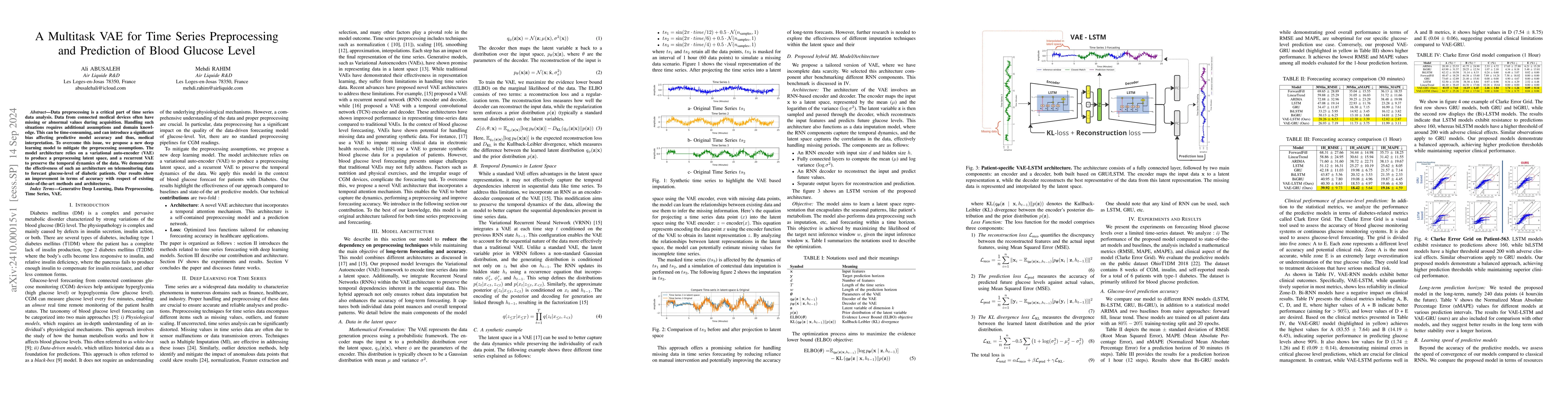This research proposes a multitask variational auto-encoder (VAE) model for preprocessing and predicting blood glucose levels from time series data. The model improves data handling of missing or abnormal values, leading to more accurate predictions compared to existing methods.