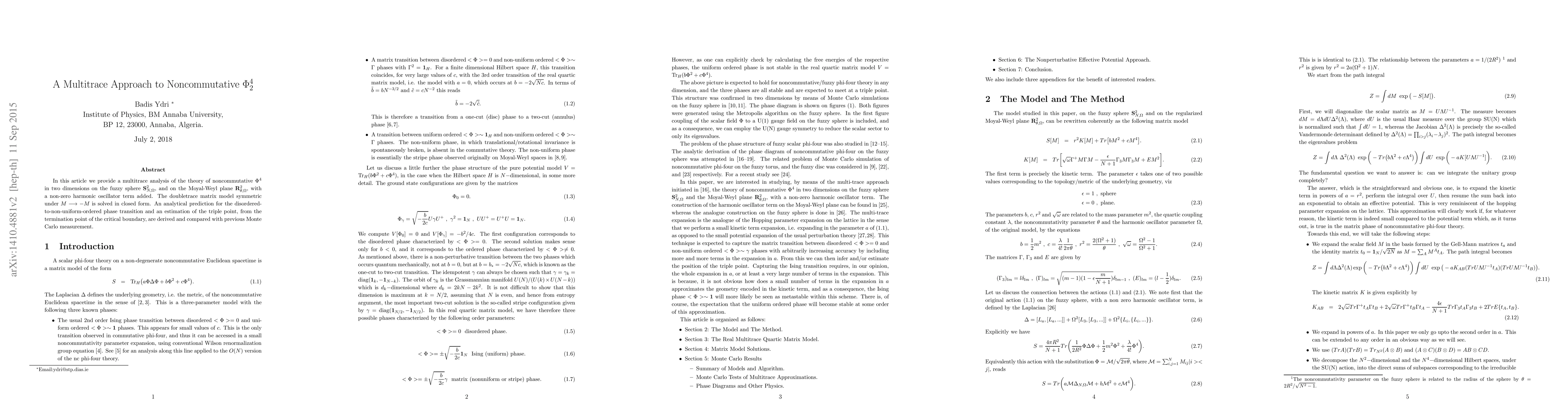 This paper presents a multitrace analysis of noncommutative $\Phi^4$ theory in two dimensions on the fuzzy sphere and the Moyal-Weyl plane, solving the doubletrace matrix model in closed form. Analytical predictions for the disordered-to-non-uniform-ordered phase transition and the triple point are derived and compared with previous Monte Carlo measurements.