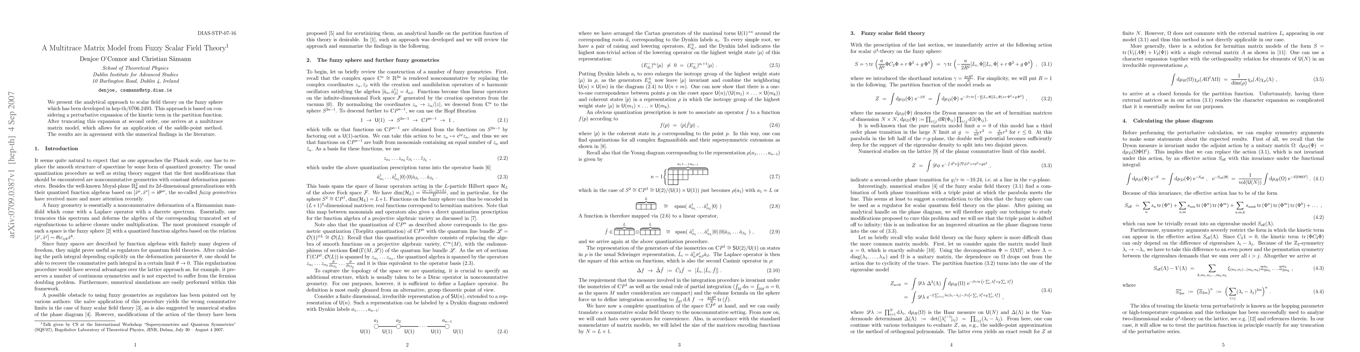 This paper develops an analytical approach to scalar field theory on the fuzzy sphere, leading to a multitrace matrix model derived from a perturbative expansion of the kinetic term. The results align with existing numerical findings.
