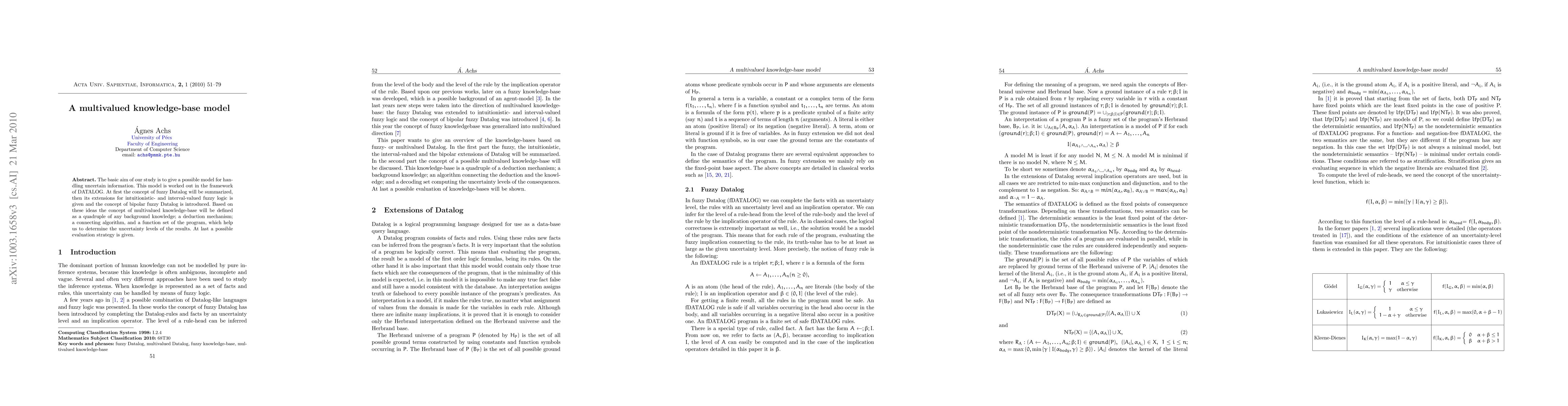 The basic aim of our study is to give a possible model for handling uncertain information. This model is worked out in the framework of DATALOG. At first the concept of fuzzy Datalog will be summarized, then its extensions for intuitionistic- and interval-valued fuzzy logic is given and the concept of bipolar fuzzy Datalog is introduced. Based on these ideas the concept of multivalued knowledge-base will be defined as a quadruple of any background knowledge; a deduction mechanism; a connecting algorithm, and a function set of the program, which help us to determine the uncertainty levels of the results. At last a possible evaluation strategy is given.