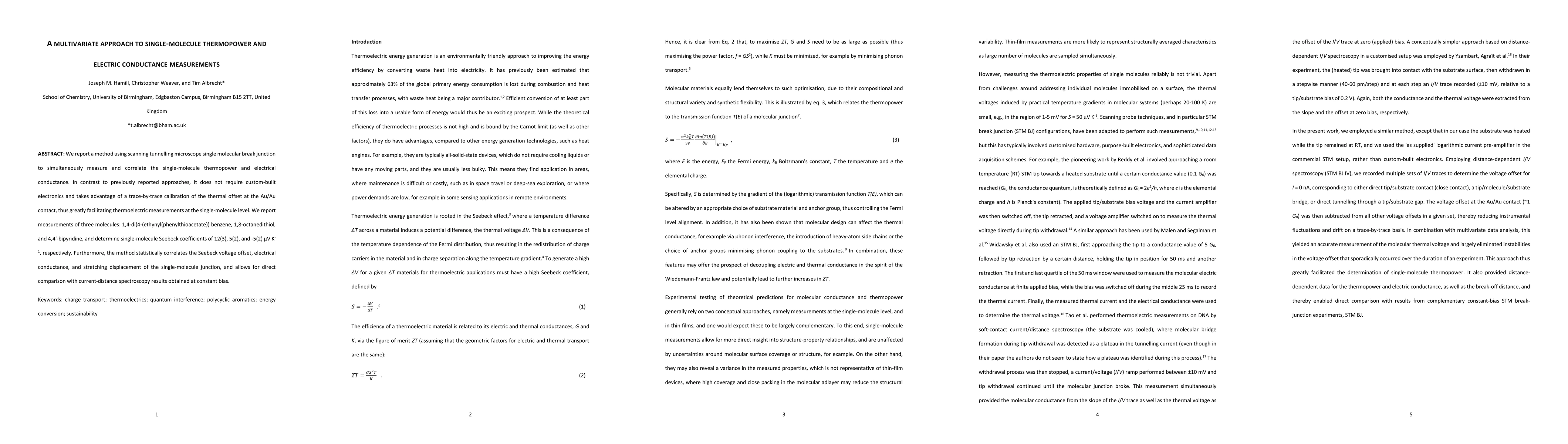 This paper introduces a novel scanning tunnelling microscope method for simultaneous single-molecule thermopower and electrical conductance measurements, eliminating the need for custom electronics and enabling trace-by-trace thermal offset calibration. The method correlates Seebeck coefficients, electrical conductance, and stretching displacement for three molecules, facilitating thermoelectric studies at the single-molecule level.