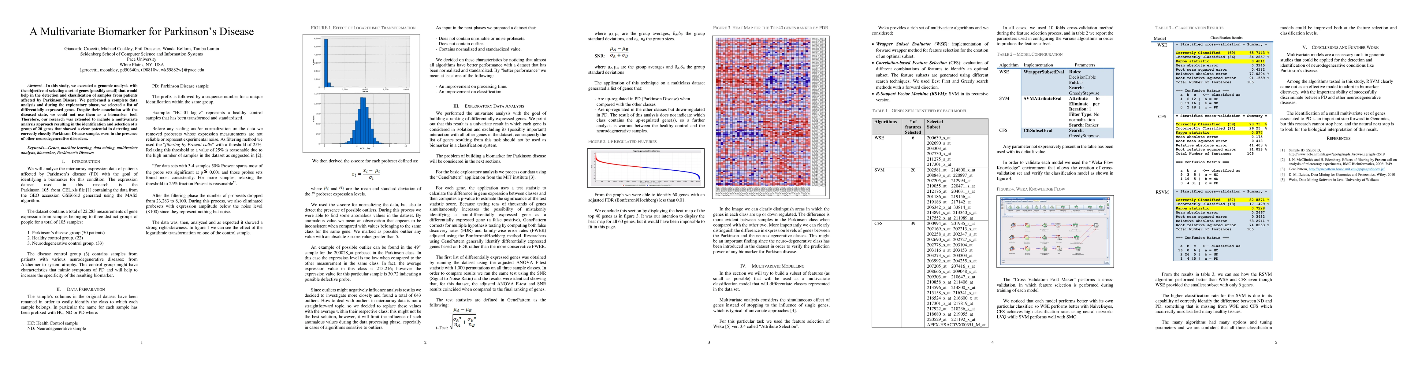 In this study, we executed a genomic analysis with the objective of selecting a set of genes (possibly small) that would help in the detection and classification of samples from patients affected by Parkinson Disease. We performed a complete data analysis and during the exploratory phase, we selected a list of differentially expressed genes. Despite their association with the diseased state, we could not use them as a biomarker tool. Therefore, our research was extended to include a multivariate analysis approach resulting in the identification and selection of a group of 20 genes that showed a clear potential in detecting and correctly classify Parkinson Disease samples even in the presence of other neurodegenerative disorders.